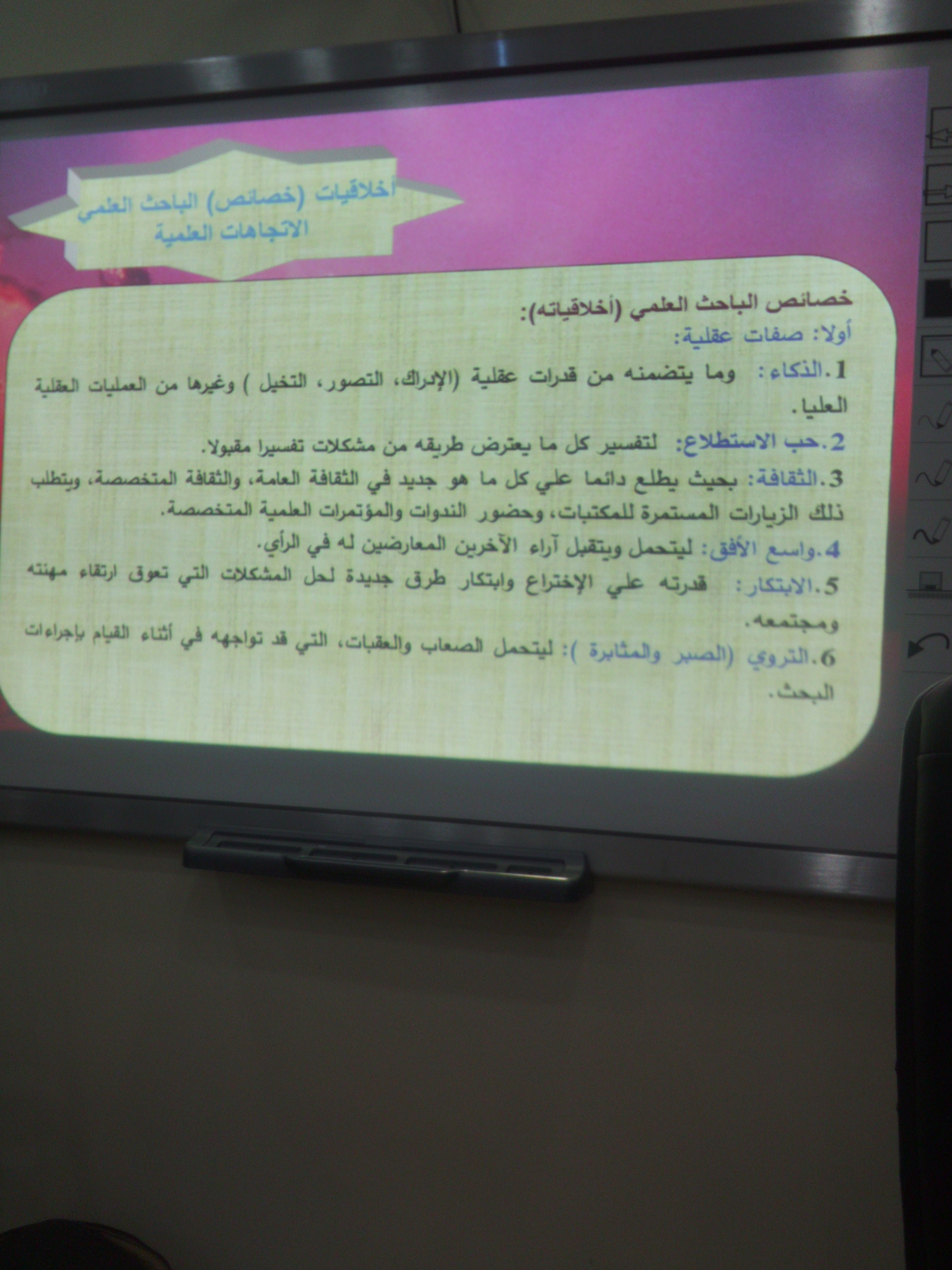 نظمت اللجنة التنظيمية للملتقى العلمي الثالث للطلاب وبالتعاون مع لجنة مشاريع التخرج- بكلية العلوم الطبية التطبيقية- أقسام الطالبات بالخرج- محاضرة بعنوان " أخلاقيات البحث العلمي " يوم الإثنين الموافق 21/1/2019 م، بمكتبة الكلية. المحاضرة كانت من إلقاء سعادة ا. الشيماء رمضان ( عضو لجنة مشاريع التخرج بالكلية ومنسقة محور الأبحاث الصحية - شطر الطالبات) ، وبحضور عينة ممثلة من الطالبات بالمستويات المختلفة بأقسام الكلية ، وكذلك شرف الحضور مجموعة من عضوات هيئة التدريس وعضوات لجنة مشاريع التخرج بالكلية. وكان هذا، في إطار حرص اللجنة على تحقيق أهداف الملتقى من رفع المستوى العلمي والثقافي لدى الطالبات وتطوير مهاراتهن البحثية والابتكارية ، وتوجيه الطالبات للمشاركة الفعالة في اقتراح حلول للمشكلات الصحية التي يواجها المجتمع، وبما يسهم في تعزيز دور الطالبات في مسئوليتهم نحو مجتمعهم. وقد تضمنت المحاضرة العناوين الرئيسية التالية: o إكساب المشاركين معارف ومهارات واتجاهات ايجابية نحو أخلاقيات البحث والباحث العلمي لنرتقي بالبحث العلمي. o مفهوم البحث العلمي وأهميته. o البحث العلمى وأهدافه. o أخلاقيات وصفات الباحث العلمي. o الضوابط الأخلاقية للبحث العلمى. هذا وقد انتهت المحاضرة فى تمام الساعة 1.00 ظ، راجين المولى عز وجل أن ينفع بها،،، منسقة لجنة مشاريع التخرج د. مروة محمد إبراهيم