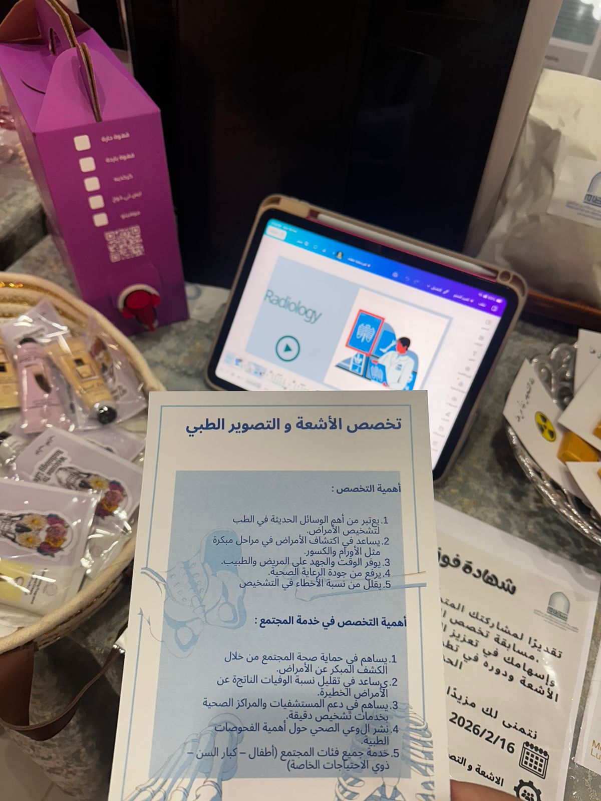 كما تضمن ركن قسم الأشعة والتصوير الطبي مطويات ووسائل توضيحية للتعريف بتخصصات الأشعة المختلفة، وشرح دور أخصائي الأشعة في التشخيص الطبي، وإجراءات السلامة المتبعة، إضافة إلى عرض صور الأشعة السينية (X-ray) وشرح آلية تفسيرها.