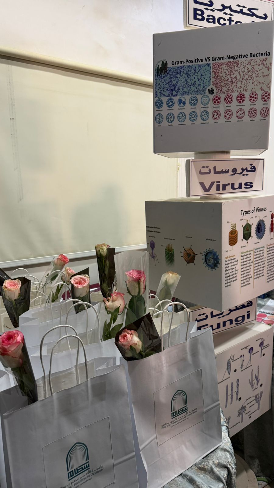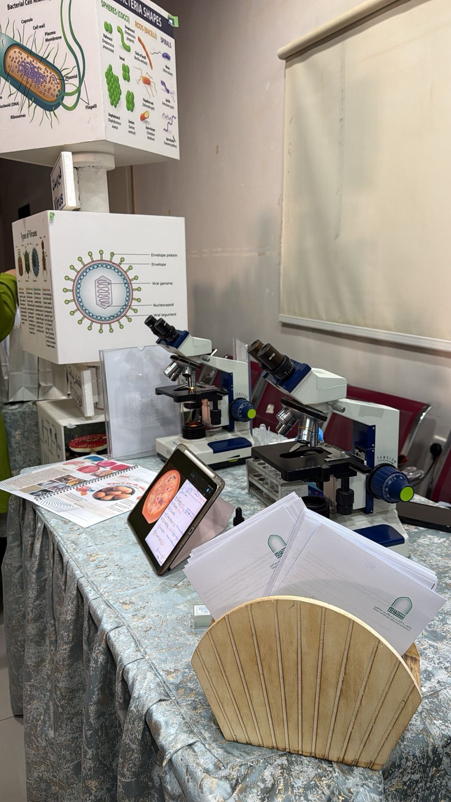 بعد ذلك، انتقلت الطالبات والمعلمات إلى الأركان التفاعلية التي نظمتها الكلية لتعريف الطالبات بطبيعة العمل في كل تخصص ودوره في المنظومة الصحية. حيث اشتمل ركن قسم المختبرات الطبية على عرض شرائح مجهرية لخلايا الدم، ومشاهدة بعض البكتيريا والكائنات الدقيقة، وتنفيذ تجربة استخراج الحمض النووي (DNA) من ثمار الفراولة، وإجراء فحص فصائل الدم، إلى جانب مطويات وتوزيعات تعليمية.