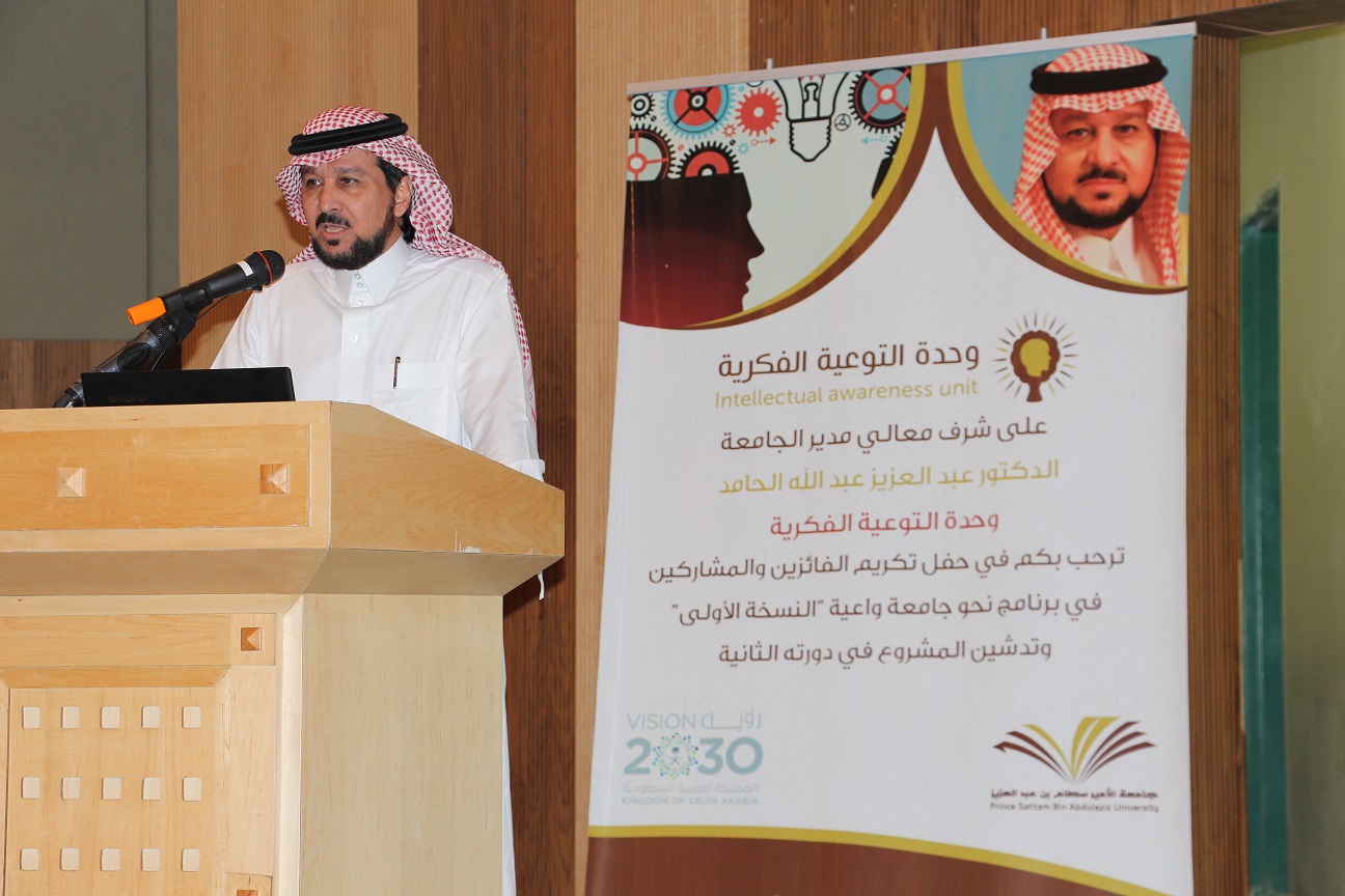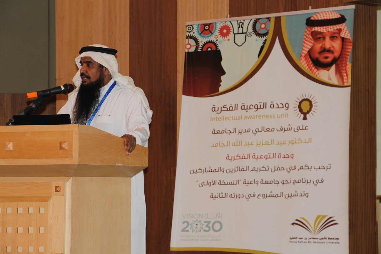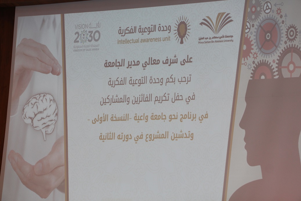 تحت رعاية كريمة من معالي مدير الجامعة الأستاذ الدكتور/عبدالعزيز الحامد وحضور سعادة وكيل الجامعة الدكتور/ عبدالله الجمعة وعدد من عمداء الكليات ، بالإضافة إلى سعادة الأستاذ الدكتور/ خالد الدبيان رئيس وحدة التوعية الفكرية بالجامعة تم ختام فعاليات مشروع (نحو جامعة واعية -1- ) وتدشين النسخة الثانية من البرنامج بعنوان (نحو جامعة واعية -2-). وقد استهل الحفل بآيات من الذكر الكريم , تلاها كلمة لسعادة الأستاذ الدكتور خالد الدبيان شارحاً فيها أهدف الوحدة وبأنها تصب في تعزيز الأمن الفكري ومواجهة الأفكار المنحرفة ومستعرضاً إنجازات الوحدة والفعاليات التي أقيمت خلال العام الجامعي 1437/ 1438هـ من برنامج ( نحو جامعة واعية -1- ) والتي نضمت عدد من المحاضرات والدورات تدريبية وحلقات النقاش بأكثر من 60 فعالية على مستوى كليات الجامعة، كما تخلل الحفل كلمة لمعالي مدير الجامعة مؤكداً فيها على أهمية عمل الوحدة وداعماً لنشاطاتها الملموسة وحاثاً الجميع على بذل المزيد من الجهود. كما نوه أيضا بأهمية التوجيه السلوكي والمعرفي وارتباطه باستقرار المجتمع. جدير بالذكر انه بعد نجاح مشروع (نحو جامعة واعية -1- ) لطلاب الجامعة فإنه قد تم إضافة عنصر الطالبات وتمكينهم من الاستفادة من فعاليات الوحدة في مشروع (نحو جامعة واعية -2-) حيث تشرف على فعاليات القسم النسائي عدد من عضوات هيئة التدريس بالجامعة.