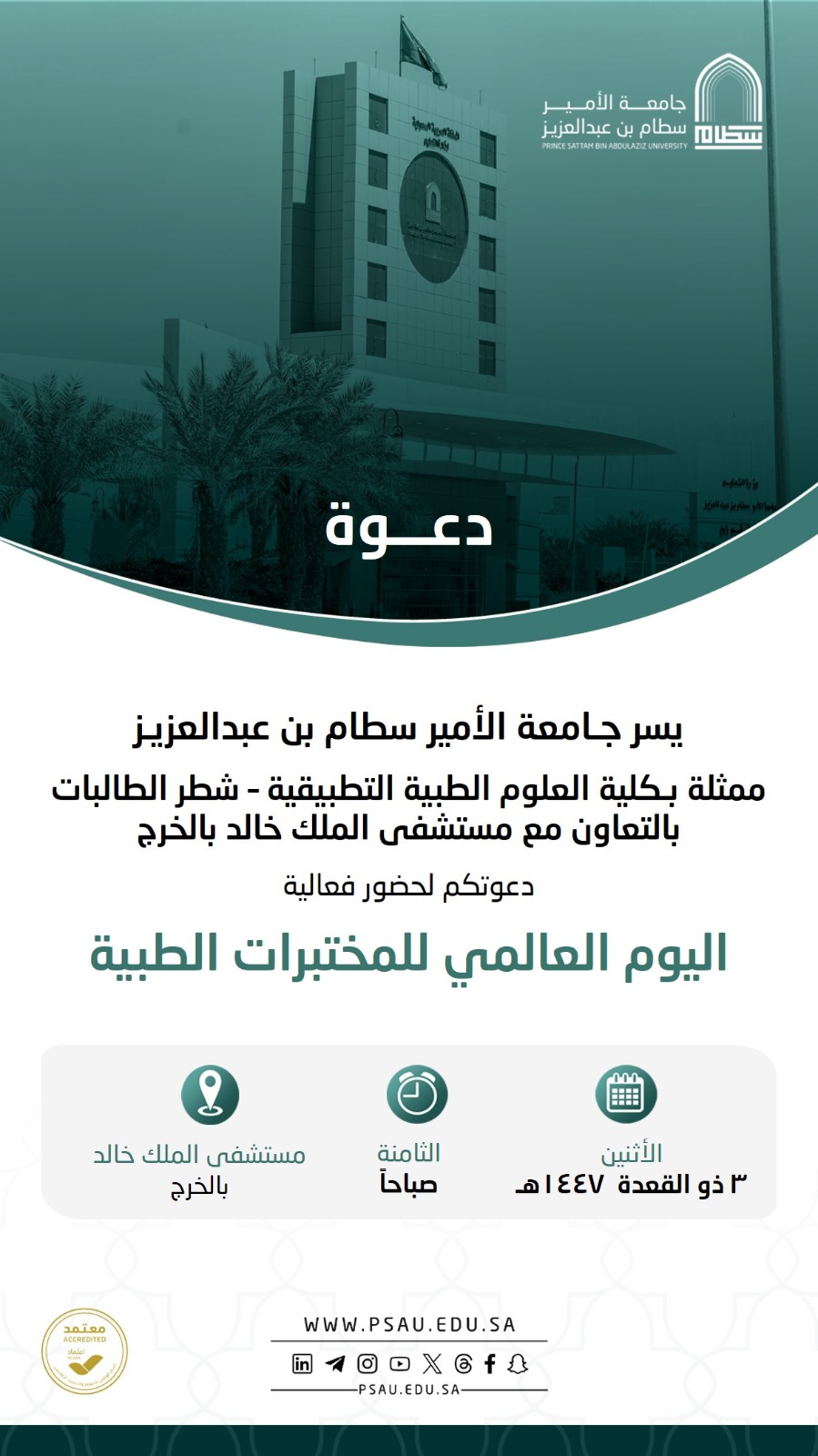 نظّمت كلية العلوم الطبية التطبيقية بالخرج شطر الطالبات وبالتعاون مع مستشفى الملك خالد بالخرج، فعالية اليوم العالمي للمختبرات الطبية وذلك يوم الاثنين الموافق 20 /4/ 2026م من الساعة الثامنة صباحًا إلى الثانية ظهرًا. وتهدف هذه الفعالية لتعزيز الوعي المجتمعي بأهمية المختبرات الطبية ودورها الحيوي في تشخيص الأمراض ودعم المنظومة الصحية.
