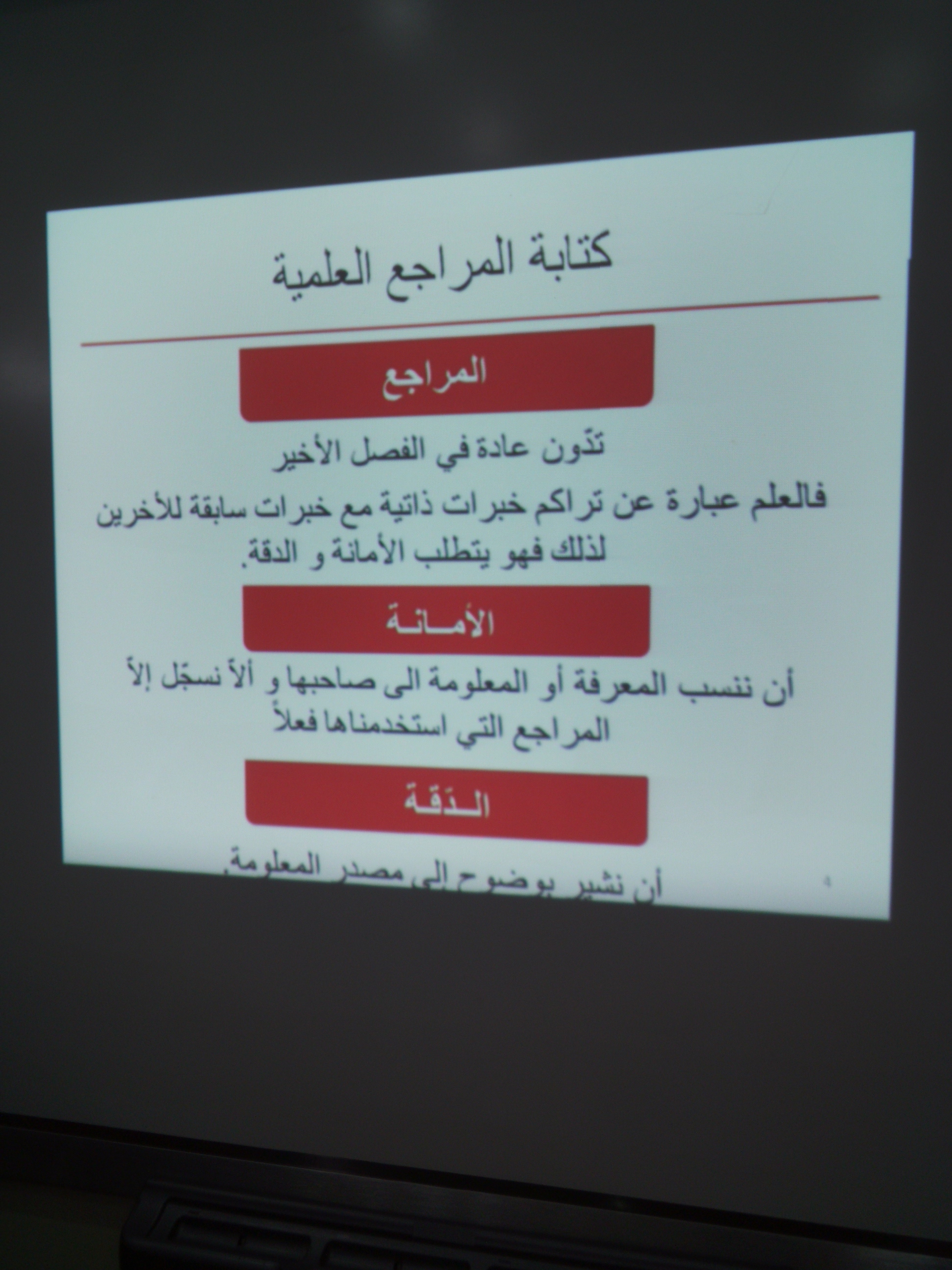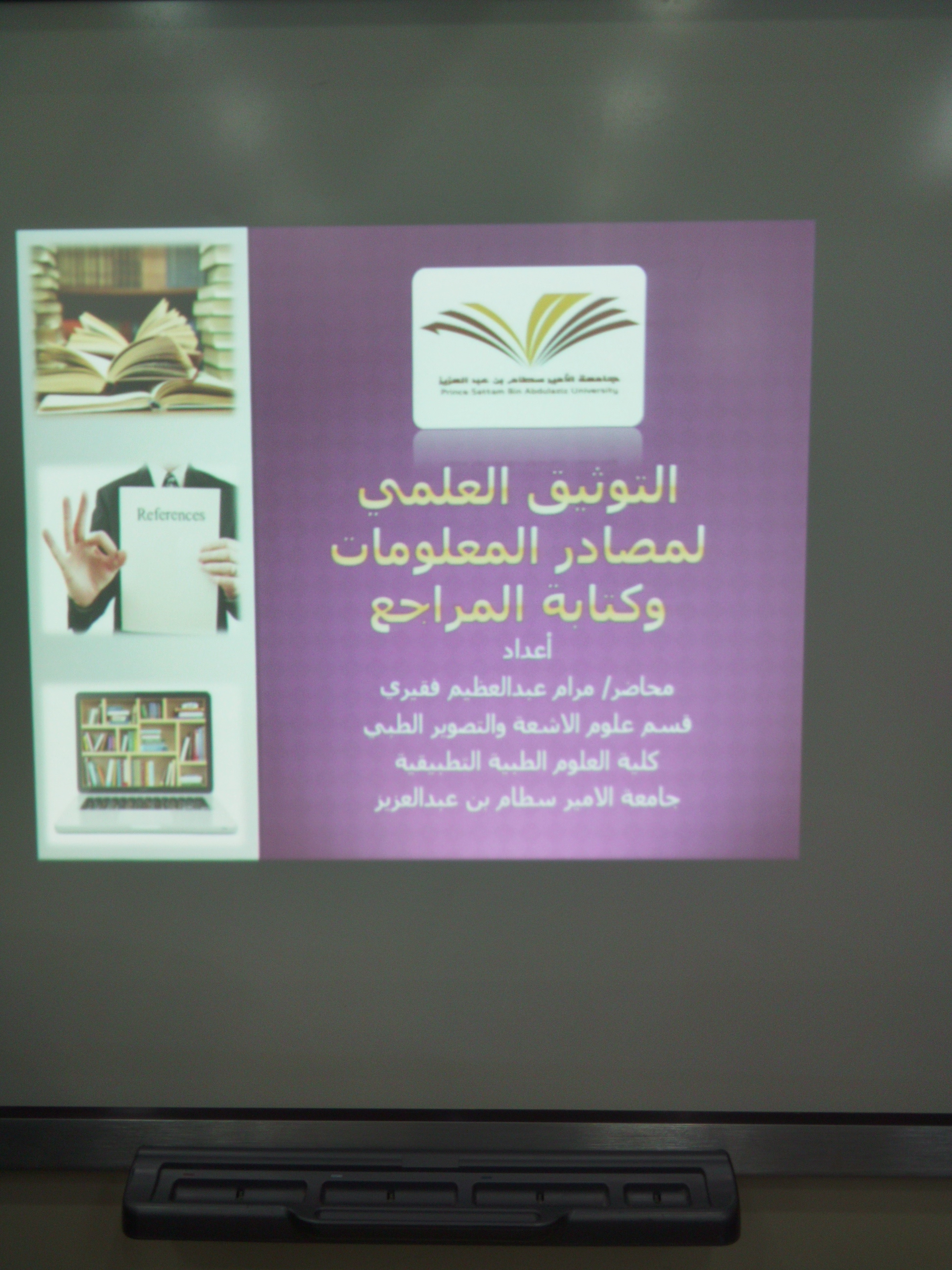 نظمت اللجنة التنظيمية للملتقى العلمى الثالث للطلاب وبالتعاون مع لجنة مشاريع التخرج- بكلية العلوم الطبية التطبيقية- بالخرج محاضرة بعنوان " التوثيق العلمى لمصادر المعلومات وكتابة المراجع " يوم الأحد الموافق 13/1/2019 م .