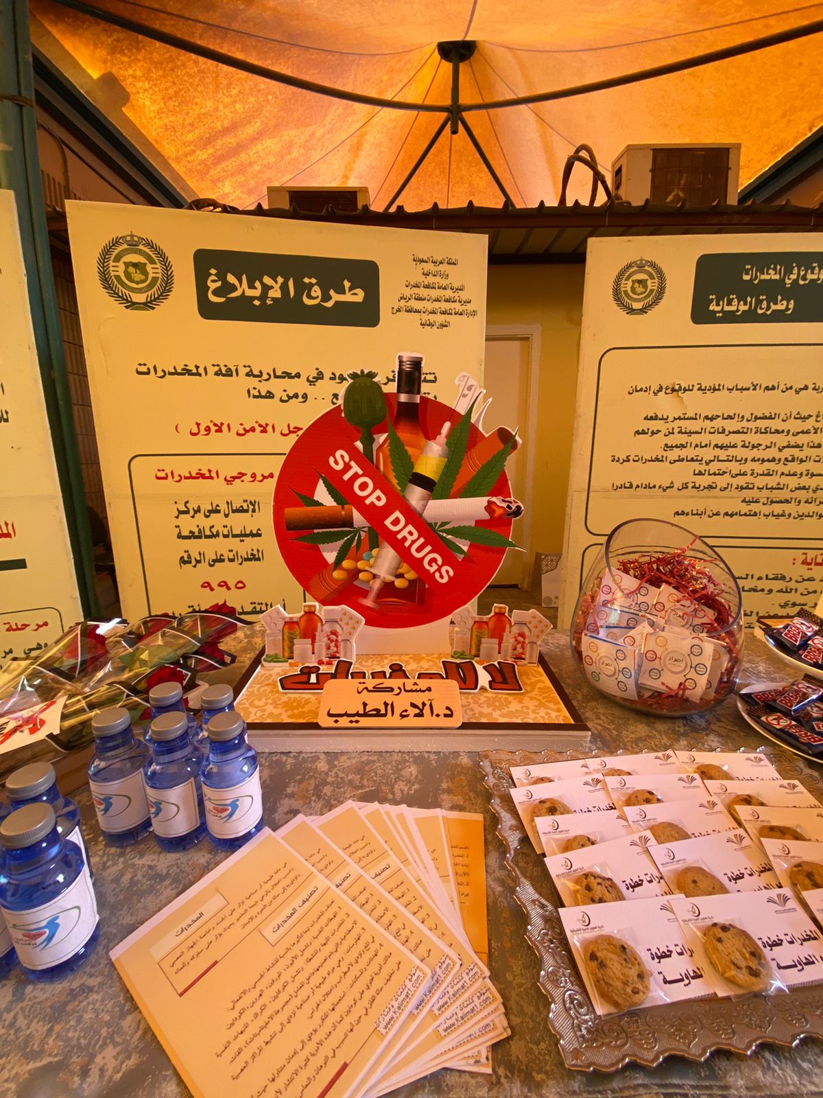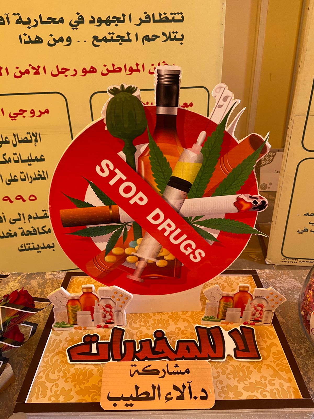 نفذت لجنة العمل المشترك بالجامعة مع المديرية العامة لمكافحة المخدرات في الجوانب التدريبية والتوعية ولجنة مكافحة التدخين بالجامعة معرض في كلية العلوم الطبية التطبيقية بالخرج - شطر الطالبات- ضمن البرامج التدريبية والتوعوية محاضرة توعوية بساحة الكلية  في يومي الثلاثاء والأربعاء الموافق 30-3/31 /1443هـ تحت اشراف لجنة العمل المشترك مع المديرية العامة لمكافحة المخدرات في الجوانب التدريبية والتوعوية ولجنة مكافحة التدخين بالجامعة معرض بعنوان لا للمخدرات واحتوى المعرض على بنرات عن أنواع المخدرات وإساءة استخدام العقاقير واضرارها وطرق الإبلاغ لمكافحة المخدرات وتعريف للمخدرات ومراحل الإدمان واضرار المخدرات واقترانها بالجريمة وأسباب الوقوع في المخدرات وطرق الوقاية ومنشورات وتوزيعات ومجسمات للتوعية بعدم تناول المخدرات و لتوعية الافراد عن ضرر التدخين وكيف تكتشف الاسرة الشخص المتعاطي بالإضافة إلى فيديو للتوعية عن مراكز التدخين الموجودة بالمملكة و كيفية التشجيع علي ترك التدخين والمخدرات. ولاقت الفعالية حضور كبير جدا من أعضاء هيئة التدريس والهيئة الإدارية والطالبات والإجابة على استفساراتهم.
