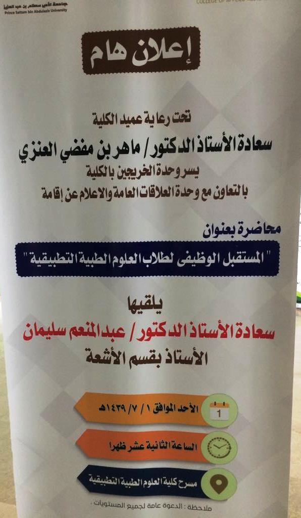 تحت رعاية سعادة عميد الكلية أ.د/ ماهر بن مفضي العنزي،أقامت وحدة الخريجين بكلية العلوم الطبية التطبيقية بالتعاون مع وحدة العلاقات العامة بالكلية يوم الاحد الموافق 1\7\1439هـ في تمام الساعة 12 ظهراً حيث امتدت لمدى ساعة محاضرة بعنوان (المستقبل الوظيفي لأخصائي العلوم الطبية التطبيقية).