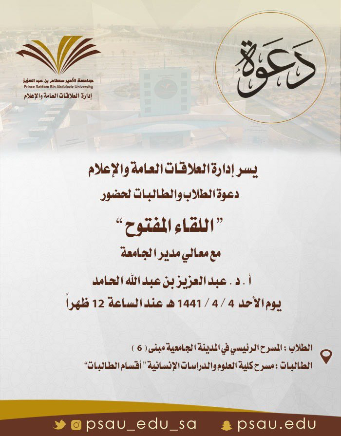يسر إدارة العلاقات العامة والإعلام دعوة الطلاب والطالبات لحضور ((القاء المفتوح  )) مع معالي مدير الجامعة الأستاذ الدكتور عبدالعزيز بن عبدالله الحامد، وذلك يوم الأحد 1441/4/4هـ عند الساعة 12ظهراً وعلى المسرح الرئيسي للجامعة بالمدينة الجامعية مبنى رقم (6) للطلاب ،وعلى مسرح كلية العلوم والدراسات الإنسانية  -أقسام الطالبات - للطالبات الجامعة .