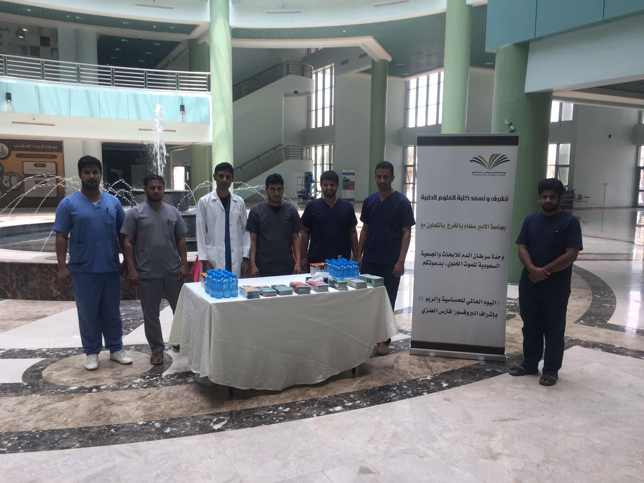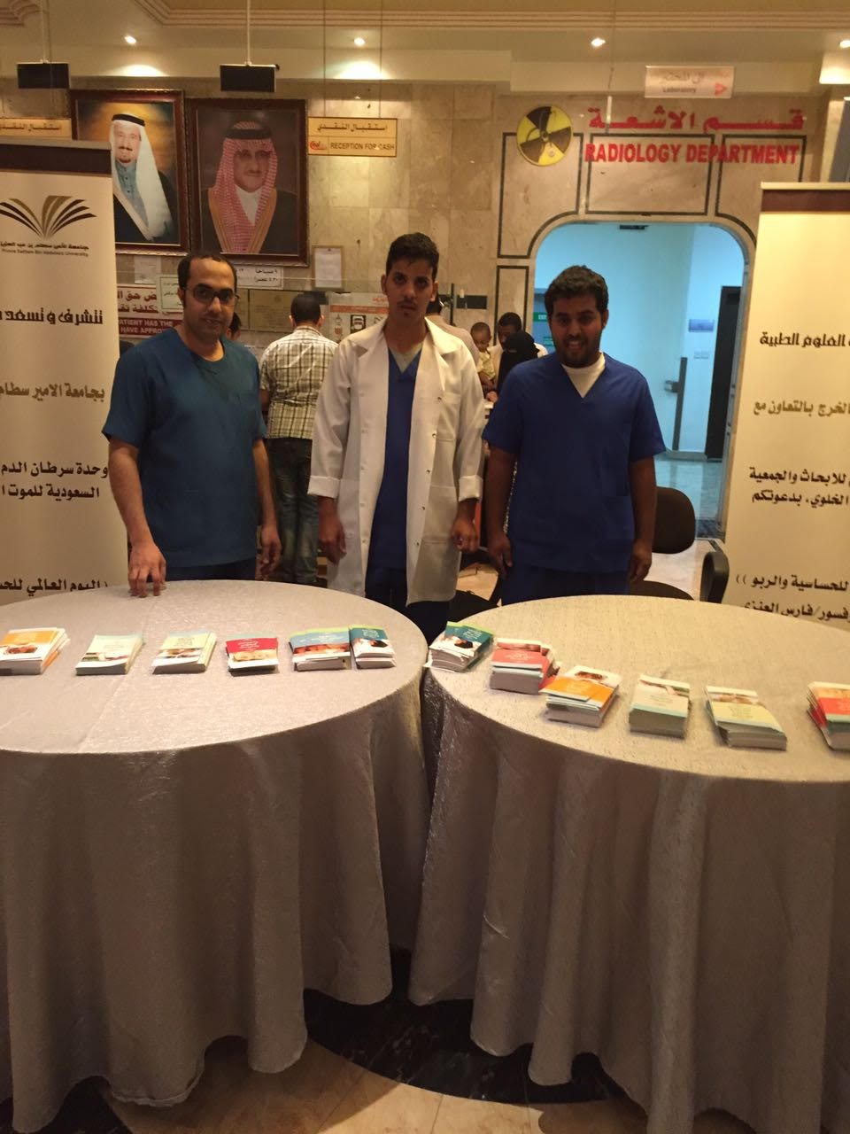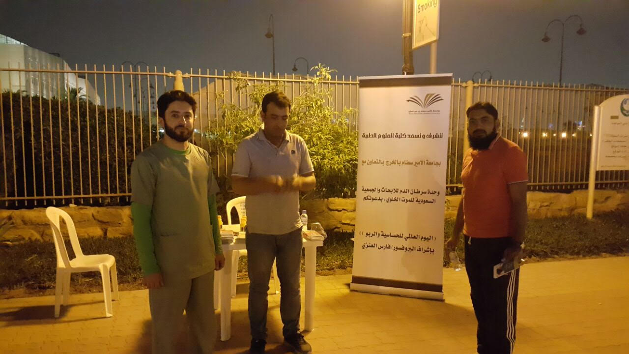 د فارس العنزي نظم قسم المختبرات الطبية بكلية العلوم الطبية التطبيقية بجامعة الامير سطام بن عبدالعزيز بالخرج بالتعاون مع شريكنا بالنجاح مستشفى دار الشفا بالرياض، يوم الخميس الموافق  ٣٠ رجب ١٤٣٨هـ، نشاطا مجتمعيا توعويا عن "الربو و الحساسية" في ٣ مواقع بالخرج هي:- مقر كلية العلوم الطبية بالخرج مقر كلية الطب  بالخرج وممشى البلدية بالخرج وثلاث مواقع اخرى بالرياض، هي:- ممشى طريق الملك عبدالله وممشى حي الصفوة بشرق الرياض ومستشفى دار الشفا وشملت الفعالية توزيع للنشرات التوعوية عن امراض المناعة والحساسية، و كتيبات تعريفية عن طرق قياس المناعة. وقد تم دعم الفعالية من خلال وحدة سرطان الدم للابحاث وتحت إشراف البروفسور/فارس العنزي، استشاري واستاذ المناعة بالخرج، وقام بتنفيذ هذه الفعالية مشكورا طلاب التجسير-الدفعة الثانية بقسم المختبرات.