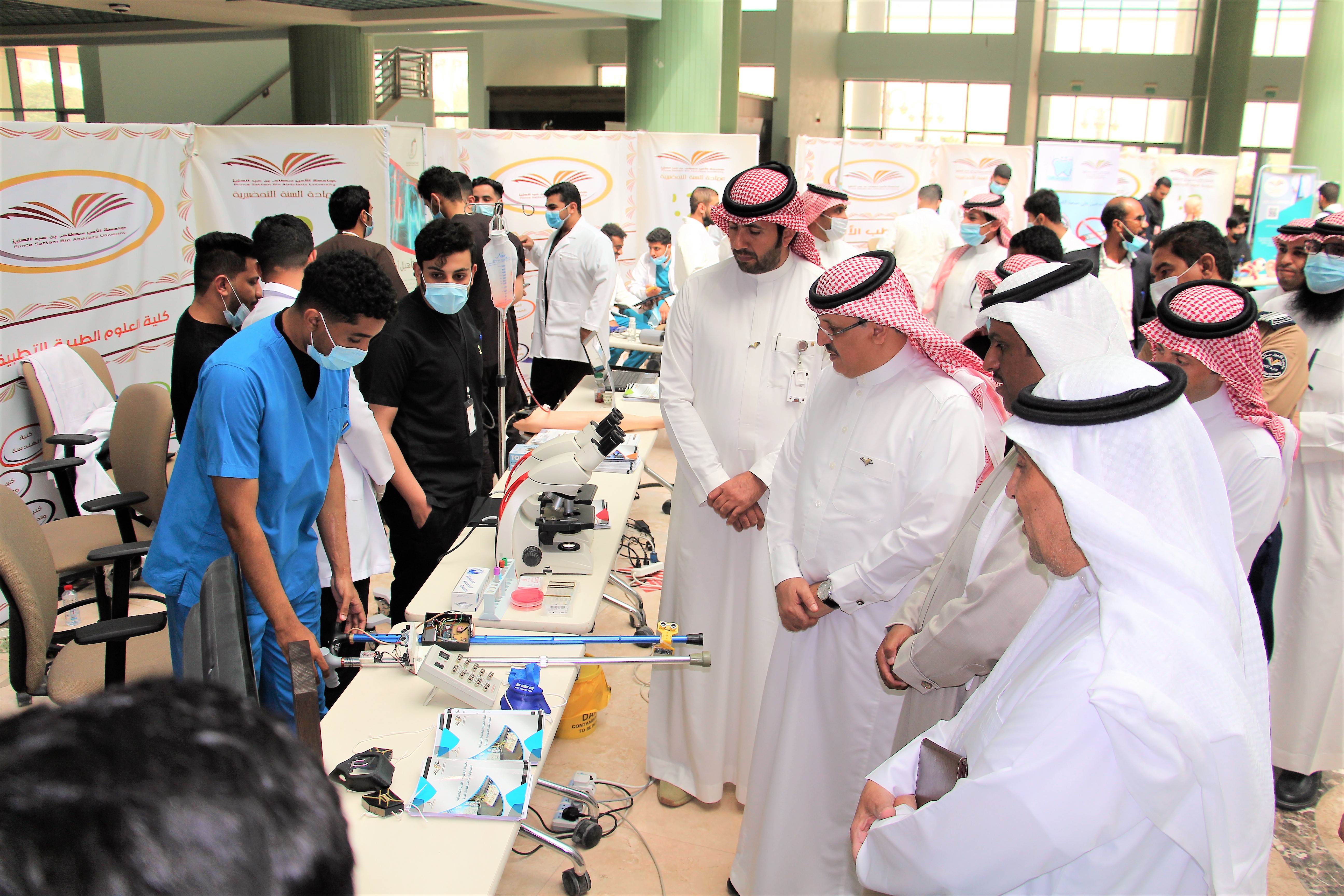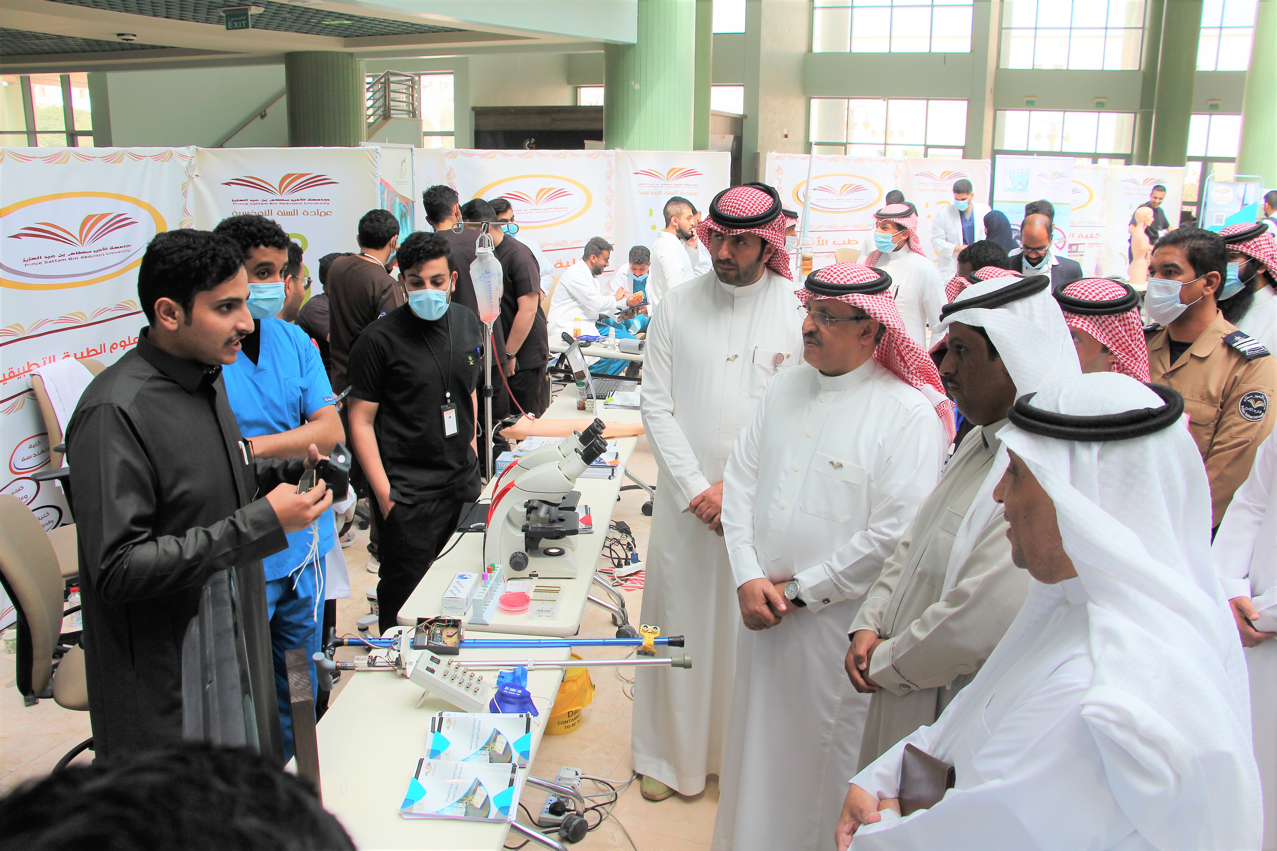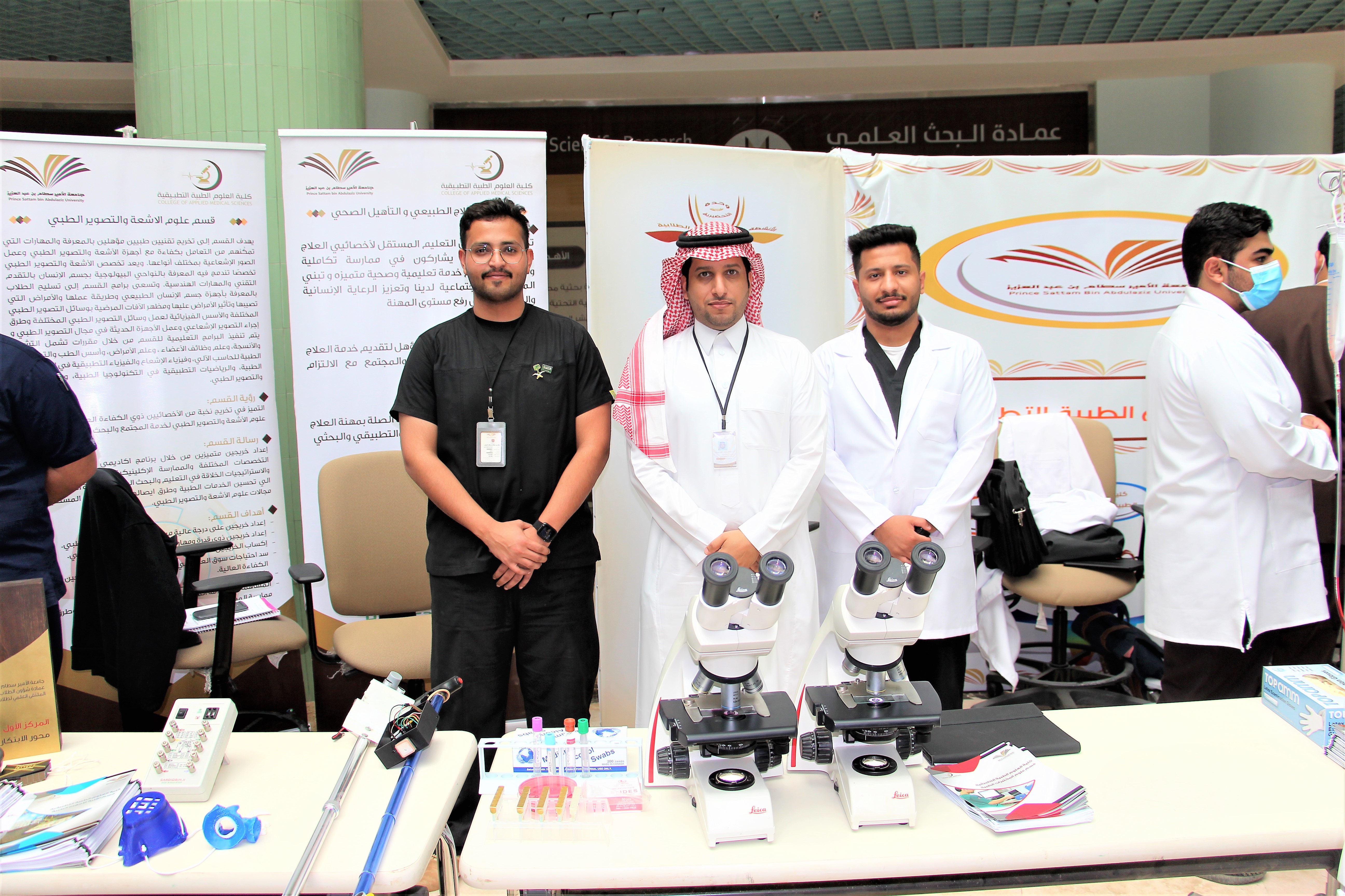 نيابة عن سعادة رئيس الجامعة الأستاذ الدكتور عبدالرحمن بن هلال الطلحي، أفتتح سعادة وكيل الجامعة للشؤون التعليمية والأكاديمية الدكتور/ مشاري بن عياد العصيمي فعاليات برنامج 'تخصصك'، ويرافقه ناصر بن سعد القحطاني وكيل الجامعة للتطوير والجودة، و بحضور عدد من أصحاب السعادة عمداء الكليات والعمادات  ووكلائها وذلك اليوم الاثنين : 4/ 8 / 1443هـ في بهو كلية العلوم الطبية التطبيقية  .   حيث قام سعادة وكيل الجامعة للشؤون التعليمية والأكاديمية الدكتور مشاري العصيمي  بقص الشريط إيذانا بافتتاح المعرض والمكون من أجنحة لكل كلية ، مقسمة بين المسار الصحي و المسار الهندسي والعلمي ، واستمع سعادته إلى شرح مفصل عن مشاركة كل جناح من خلال المعلومات التي قدمها الطلاب عن كلياتهم لزوار المعرض.   وعلى ذلك استعدت الكلية بإعداد الركن المخصص للكلية وتزويده بدليل الكلية والمنشورات اللازمة للتعرف بالأقسام الأكاديمية المختلفة وكذلك تم عرض فيلم تسجيلي يسرد تاريخ إنشاء الكلية والمعامل البحثية والقاعات الدراسية والمعملية بأجهزتها المختلفة،   وقد قام وكيل الجامعة للشؤون التعليمية والأكاديمية الدكتور/ مشاري بن عياد العصيمي والوفد المرافق له بتشريف وزيارة الركن المخصص للكلية وذلك في حضور سعادة الأستاذ الدكتور/ ماهر بن مفضي العنزي حيث قام رئيس وحدة الإرشاد الأكاديمي بتقديم مختصر عن أقسام الكلية الأكاديمية وقام بعدها طلاب الأقسام المختلفة باستعراض لبعض الأجهزة الموجودة والتي تمثل التدريب المعملي لأقسام الكلية المختلفة وشرح طبيعة عملها واستخداماتها على المرضى. وتواجد السادة أعضاء وحدة الارشاد الأكاديمي بالاشتراك مع المجلس الطلابي لمدة يومين تاليين بالقيام بالشرح والتفصيل لأقسام الكلية لطلاب السنة التحضيرية و طلاب مدارس المرحلة  الثانوية بمحافظة الخرج بهدف توجيه الطلاب إلى التخصص المناسب بما يتوافق مع طموحاتهم .