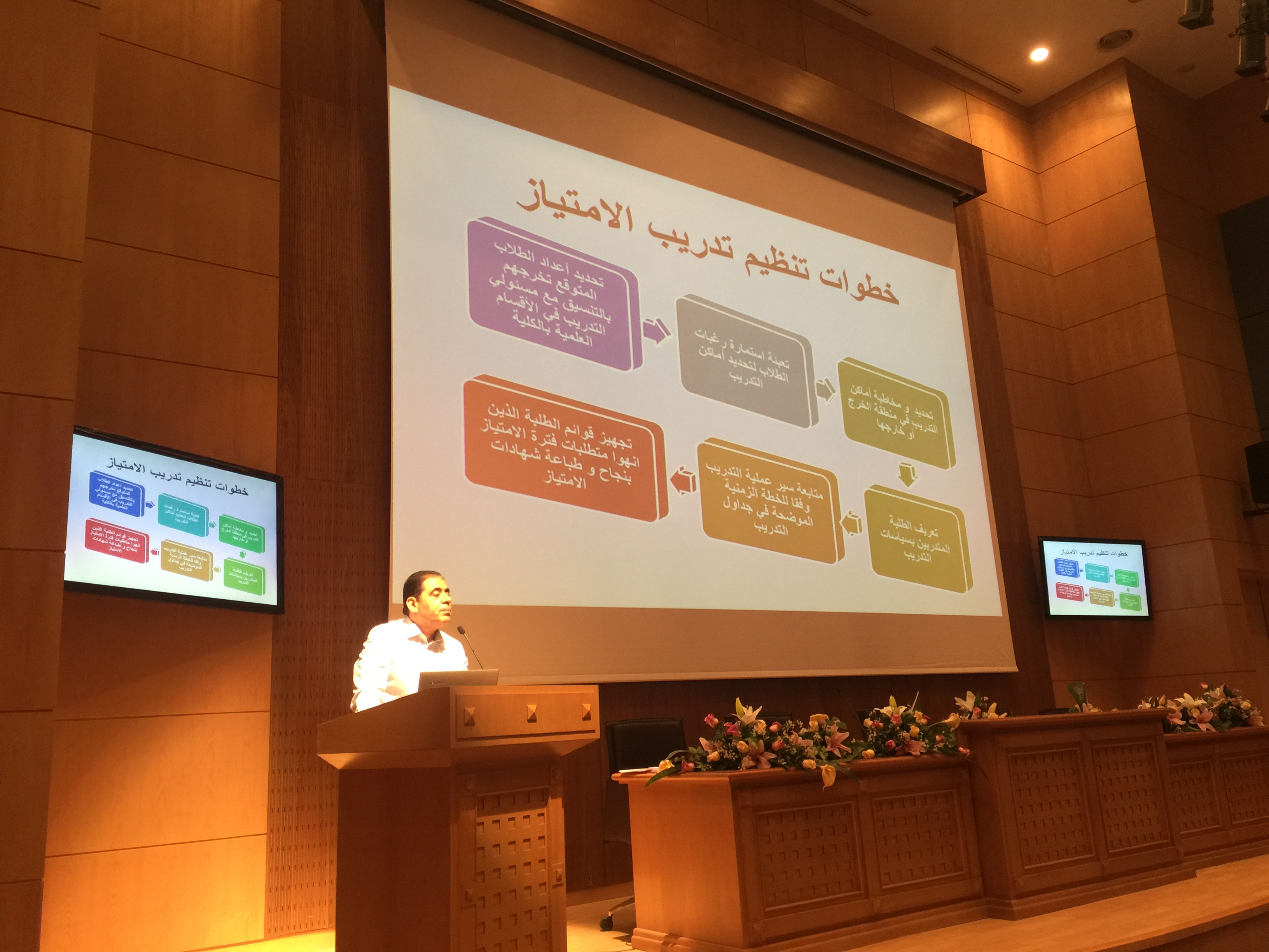 تحت رعاية سعادة عميد الكلية أ.د/ ماهر بن مفضي العنزي ،أقامت وحدة الخريجين بكلية العلوم الطبية التطبيقية بالتعاون مع وحدة العلاقات العامة بالكلية يوم الاحد الموافق 8\7\1439هـ في تمام الساعة 12 ظهراً محاضرة بعنوان (التعريف بسنة الامتياز: حقوق الطالب وواجباته) ، للدكتور/ طارق عطية: الاستاذ المشارك بقسم المختبرات الطبية)، بدأت المحاضرة بتعريف سنة الامتياز و أهميتها و شروط الالتحاق بها، ثم بدأ الحديث عن واجبات طالب الامتياز و حقوقه خلال فترة التدريب، وكذلك نظام تقييم الطالب خلال تلك الفترة التدريبية و العقوبات التي قد يتعرض لها الطالب إذا اخل بالنظم و اللوائح المتبعة في مكان التدريب.