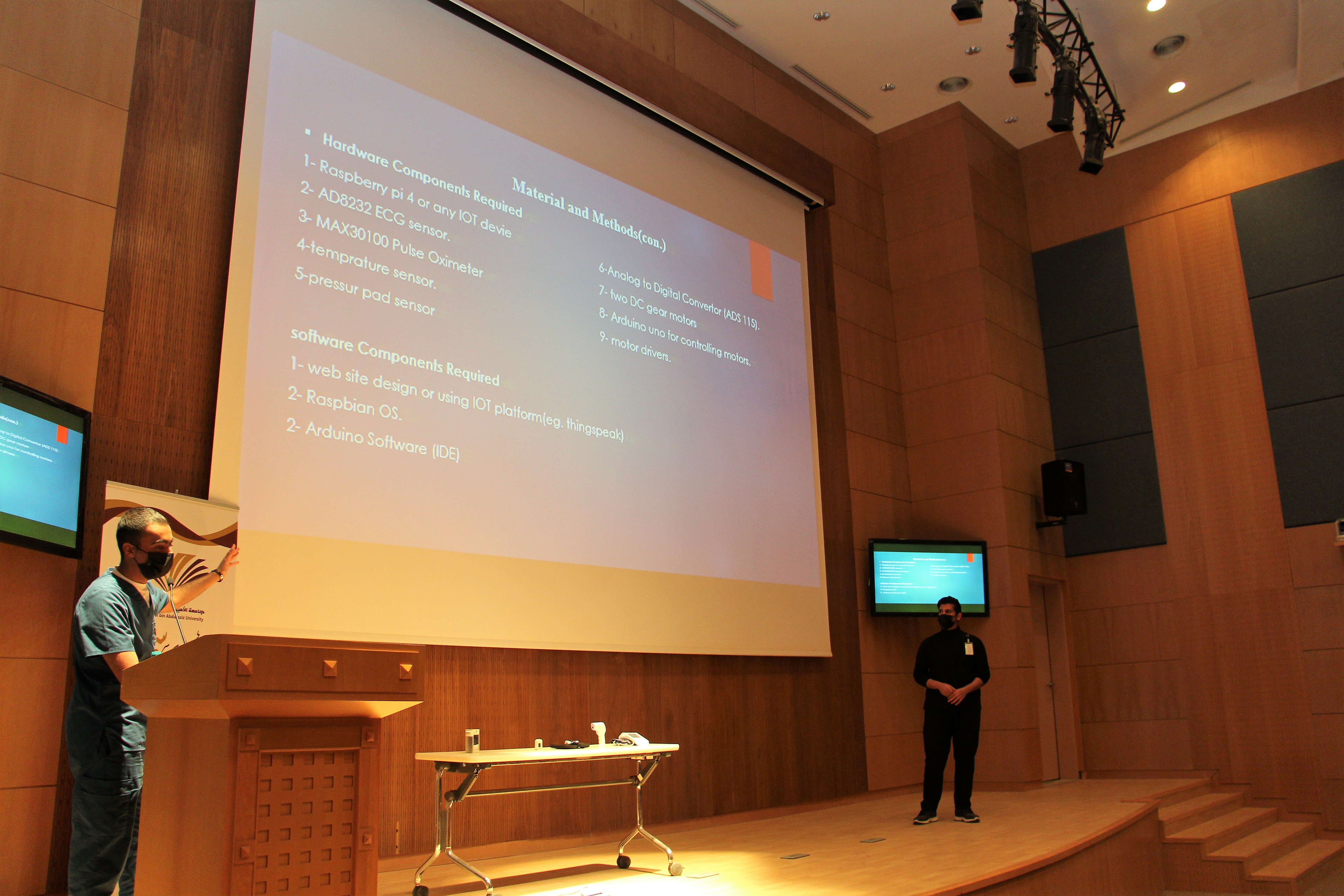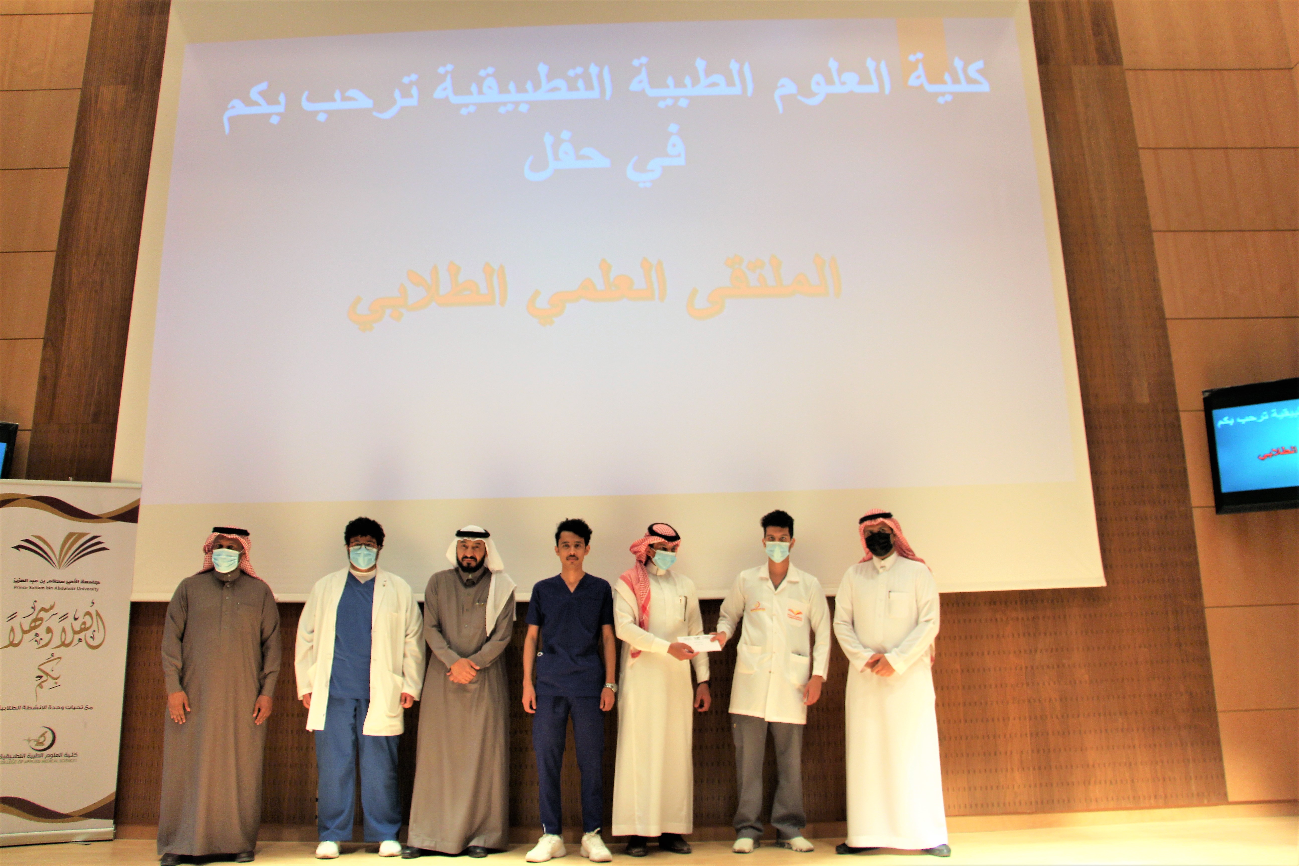 تحت رعاية عميد الكلية سعادة الأستاذ الدكتور/ ماهر بن مفضي العنزي أقامت كلية العلوم الطبية التطبيقية حفل توزيع الجوائز الخاص بالملتقى العلمي الطلابي و ذلك في يوم الخميس الموافق 30-7-1443 هــ 3-3-2021م في تمام الساعة 12 ظهراً في مسرح الكلية. بدأ الحفل بالقران الكريم و الترحيب بالحضور و كان على رأسهم سعادة الدكتور/ سعود الرويلي وكيل الكلية للشؤون التعليمية و الأكاديمية و كلاً من سعادة الدكتور/ أحمد عسيلان رئيس قسم العلاج الطبيعي و سعادة الدكتور/ يوسف الحربي رئيس قسم تقنية الأجهزة الطبية و سعادة الدكتور/ عصام الخيبري رئيس قم الأشعة و التصوير الطبي و لفيف من أعضاء هيئة التدريس و طلاب الكلية. و قد تم تحكيم العروض المقدمة من الطلاب من قبل لجنة التحكيم الموقرة المكونة من سعادة الدكتور / أحمد يوسف و سعادة الدكتور /أنور الشروف و سعادة الأستاذ الدكتور/ رجب كمال الانجار. و بدأت لجنة التحكيم من محور الابتكار و الاختراع و من ثم محور المبادرات المجتمعية التطوعية و بعده محور الأفلام التوعوية و أخيراً محور الأبحاث، تم خلالها عرض موجز من الطلاب لأعمالهم أمام لجنة التحكيم و تم مناقشة الطلاب مناقشة علمية شيقة أثرت الحضور بالعلم و الإفادة. و بعد انتهاء فترة التحكيم أعلنت النتائج و تم توزرع الجوائز على النحو التالي: أولاً:محور الابتكار و الاختراع: المركز الأول: نايف متعب الظفيري، إياد محمد الحربي. المركز الثاني: عبدالرحمن علي العامر، خالد محمد ال شفلوت، فيصل عبدالرحمن الشهري. المركز الثالث: مها علي القحطاني. ثانياً: محور المبادرات التطوعية: المركز الأول: مها علي القحطاني. المركز الثاني: عبدالله حمد العتيبي، عبدالله أحمد الزهراني، محمد صالح العتيبي، وائل عبدالله المفلح. المركز الثالث: عبدالاله عبدالله العنزي، بسام محمد الكعبي، البراء بندر الرحيمان، علي حمدان العمري، راكان رشدان العنزي، مؤيد محمد المباركي.