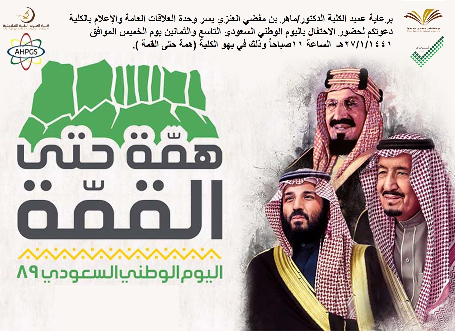 برعاية عميد الكلية الدكتور/ماهر بن مفضي العنزي يسر وحدة العلاقات العامة والإعلام بالكلية دعوتكم لحضور الاحتفال باليوم الوطني السعودي التاسع والثمانين يوم الخميس الموافق 27/1/1441هـ  الساعة 11صباحاً وذلك في بهو الكلية (همة حتى القمة ).