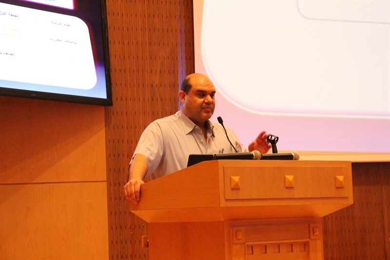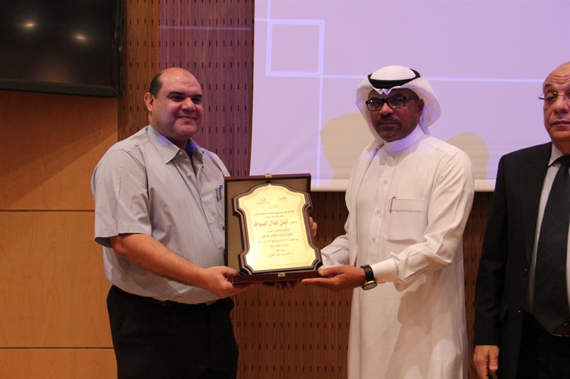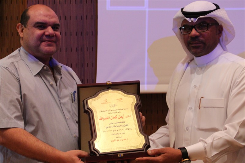بعد ذلك قام سعادة الدكتور/ طارق الحديدي وكيل الكلية بتكريم سعادة الكتور/ أيمن الصواف وتقديم درع لسعادتة على مشاركتة الإيجابية والمحاضرة القيمة التي قدمها.