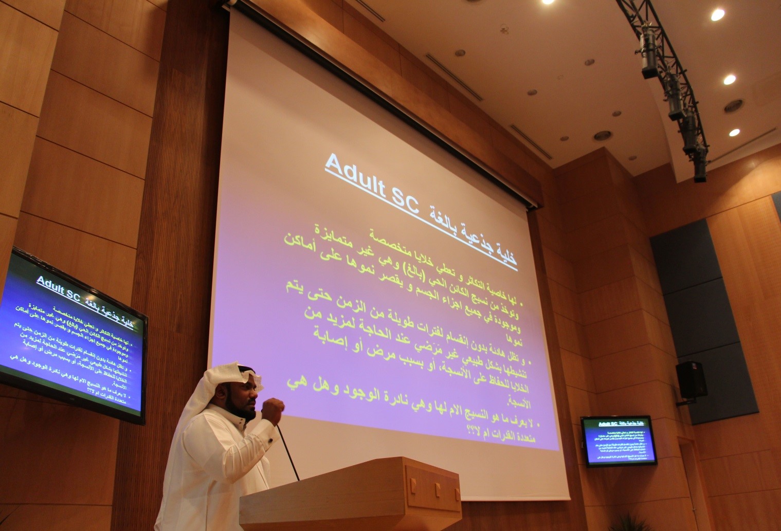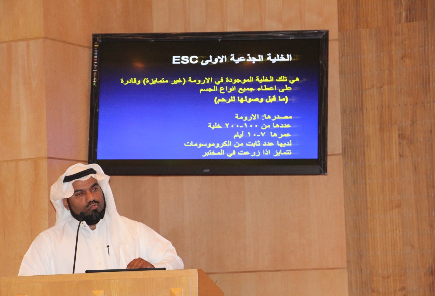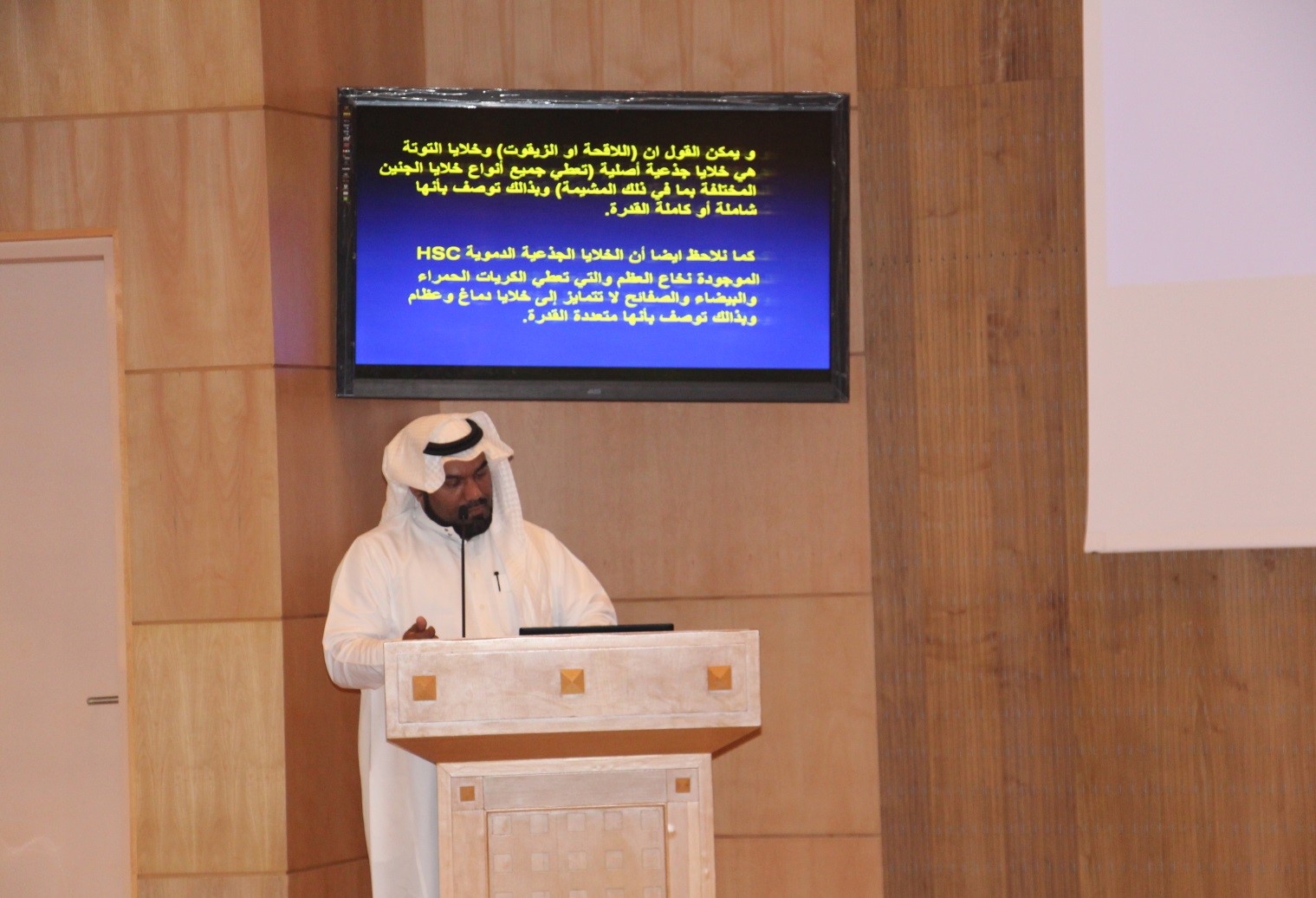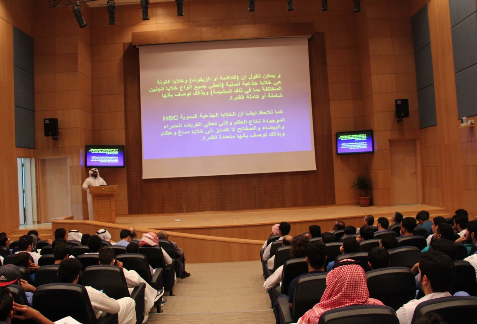 تحت رعاية عميد الكلية الأستاذ الدكتور / ماهر بن مفضي العنزي أقامت وحدة شؤون الطلاب بالتعاون مع العلاقات العامة محاضرة بعنوان " الخلايا الجذعية بين الواقع و التطبيق " ألقاها سعادة الأستاذ الدكتور / فارس العنزي في يوم الاثنين الموافق 27/2/1440 هـــ في مسرح الكلية في تمام الساعة الحادية عشرة صباحاً. بدأ فيها بالتعريف عن ماهية الخلايا الجذعية و أين توجد في جسم الانسان و كيفية استخراجها. و قد تطرق الى الوسائل الحديثة من التكنولوجيا المستخدمة لزرعها في جسم الانسان و التطبيقات المختلفة للأمراض المتنوعة. وأيضاً نوه المحاضر عن الأمراض التي تم تحقيق النجاح فيها باستخدام تطبيقات الخلايا الجذعية. و نهاية المحاضرة تم تخصيص وقت للأسئلة و الاستفسارات للإجابة عليها من قبل الدكتور فارس و أعرب المنظمون و الطلاب عن شكرهم العميق لسعادة الأستاذ الدكتور فارس العنزي على ما قدمه من معلومات قيمة في هذا الموضوع.