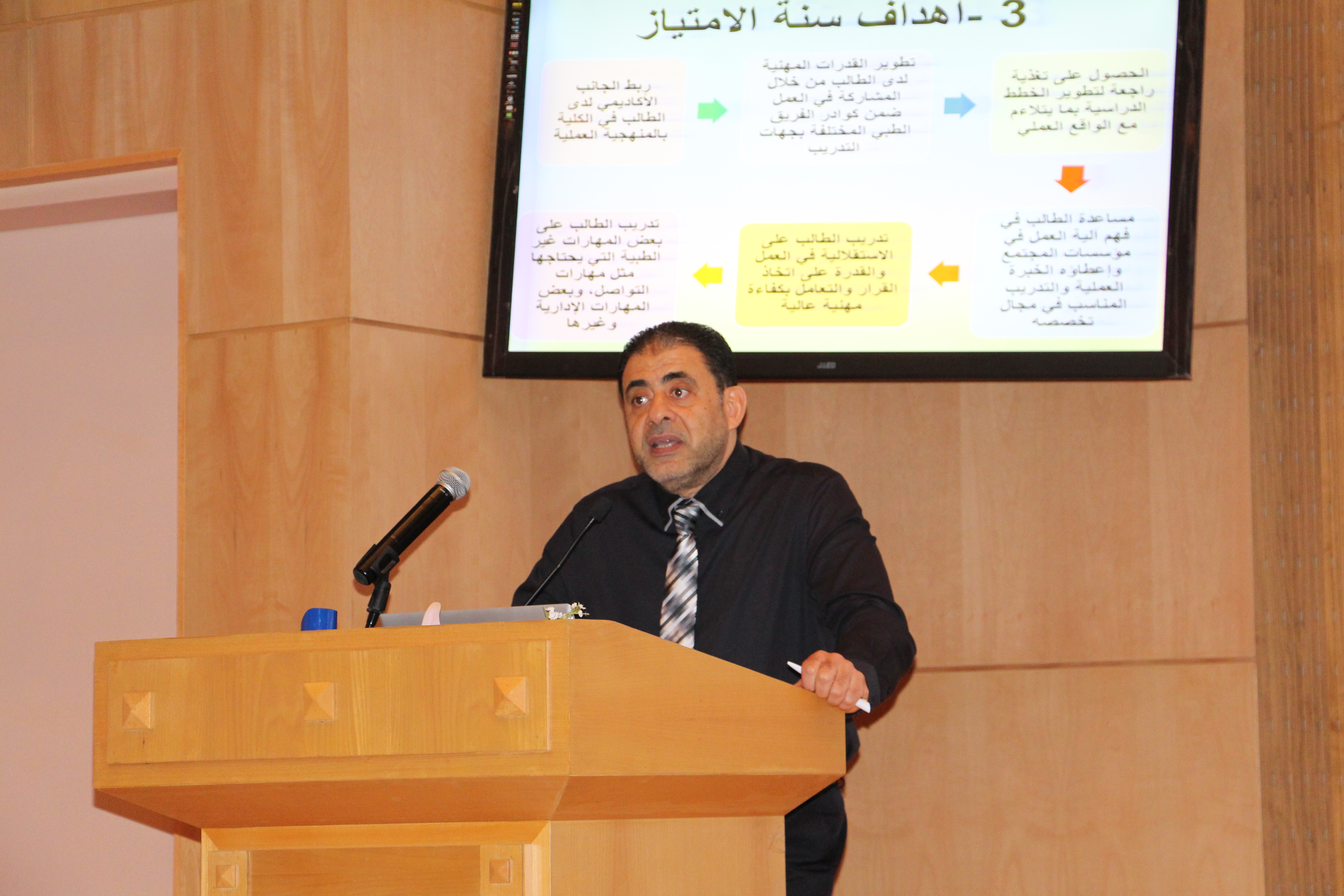 تحت رعاية سعادة عميد الكلية أ.د/ ماهر بن مفضي العنزي أقامت وحدة الخريجين بكلية العلوم الطبية التطبيقية بالتعاون مع وحدة العلاقات العامة بالكلية يوم الاثنين الموافق 18\7\1440هـ  في تمام الساعة 12 ظهراً محاضرة بعنوان (التعريف بسنة الامتياز) للدكتور/ طارق عطية ، الاستاذ المشارك بقسم المختبرات الطبية بالكلية.وكان هدف المحاضرة التعريف سنة الامتياز و أهميتها و شروط الالتحاق بها، ثم التعريف بواجبات طالب الامتياز و حقوقه خلال فترة التدريب، وكذلك نظام تقييم الطالب أثناء وفى نهاية فترة التدريب.كما تطرق الحديث الى العقوبات التي قد يتعرض لها الطالب إذا أخل بالنظم و اللوائح المتبعة في مكان التدريب. وفي النهاية استقبل المحاضر أسئلة الحضور وقام بالإجابة عليها.