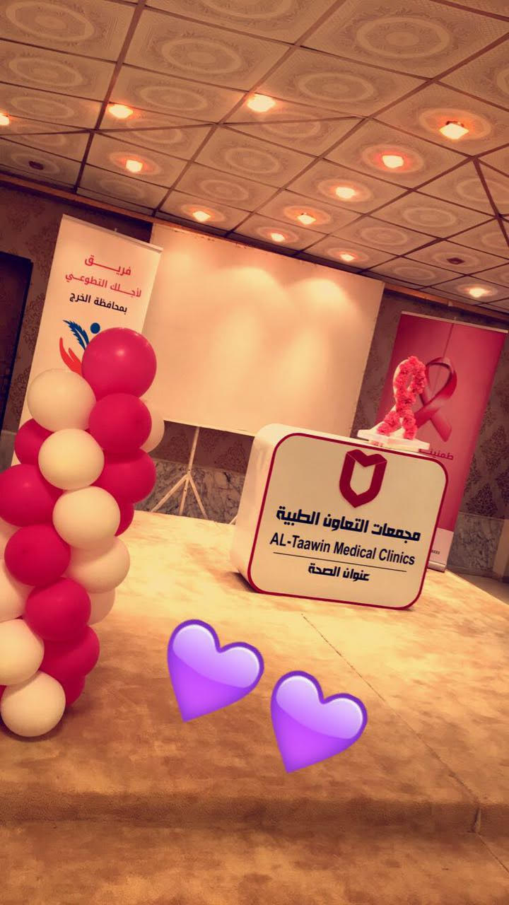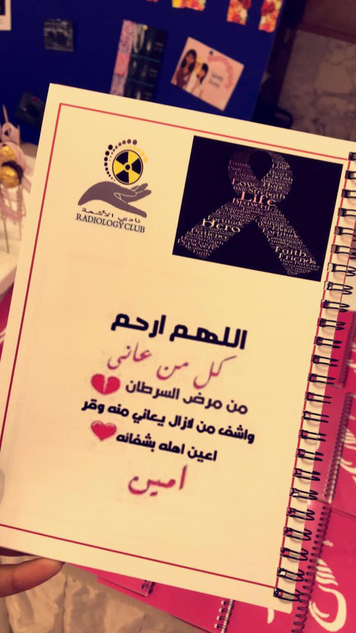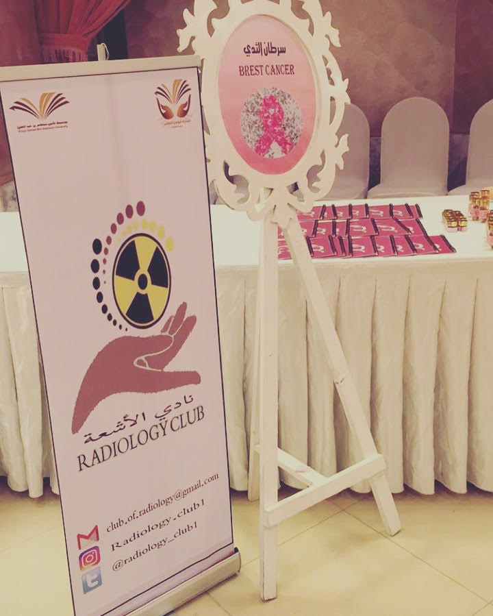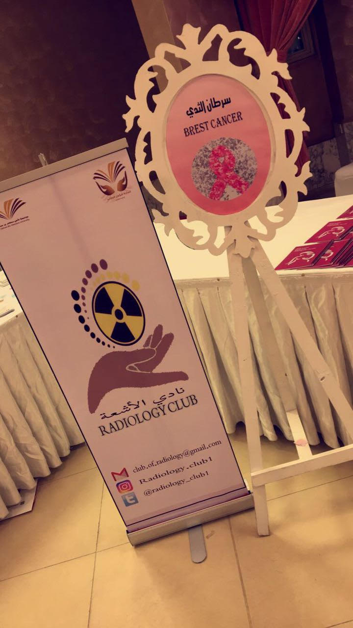 شارك نادي الأشعة بكلية العلوم الطبية التطبيقية (أقسام الطالبات ) ممثلاً للجامعة بالملتقى الحواري الثاني بعنوان(حملتنا الوردية برسالة توعوية ) للتوعية بسرطان الثدي وذلك مساء الخميس الموافق 1/9/ 1438هـ والمقام في فندف شمسة وبتنظيم من مجمعات التعاون الطبية.