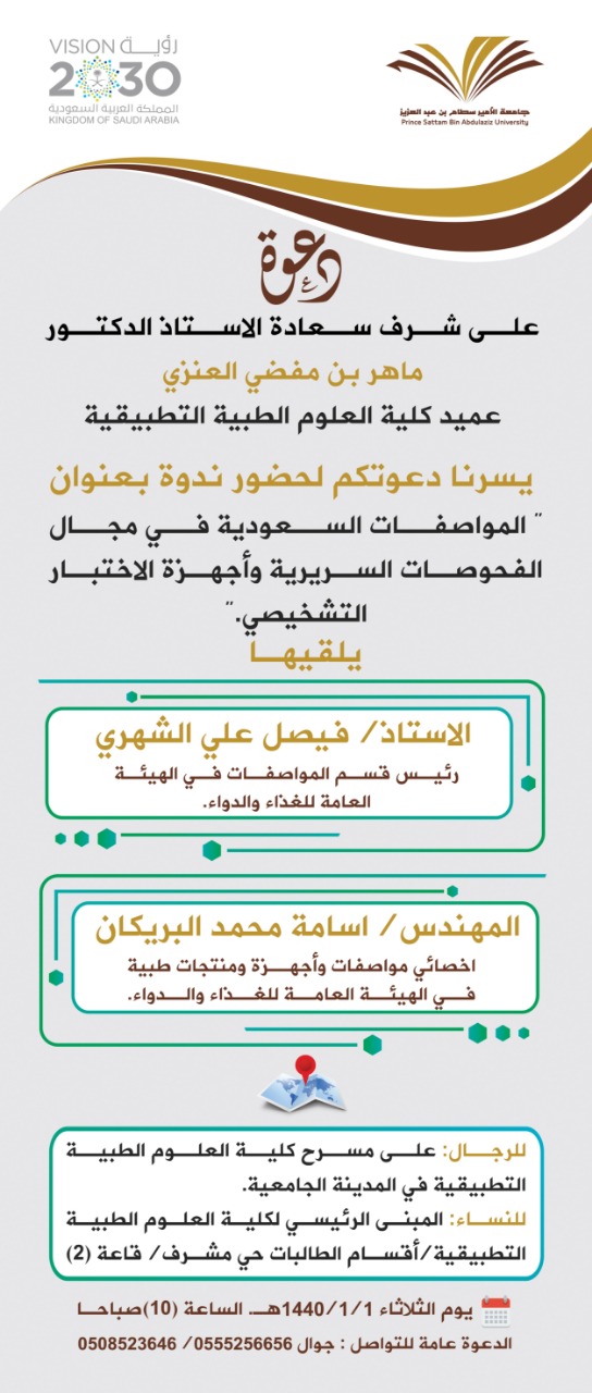 تقيم كلية العلوم الطبية التطبيقية ندوى بعنوان ( المواصفات السعودية في مجال الفحوصات السريرية وأجهزة الأختبار التشخيصي) وذلك يوم الثلاثاء الساعة 10 صباحاً على مسرح الكلية للرجال وفي مبنى كلية العلوم الطبية التطبيقية قسم -الطالبات- في المبنى الرئيسي بحي مشرف قاعة رقم 2 .