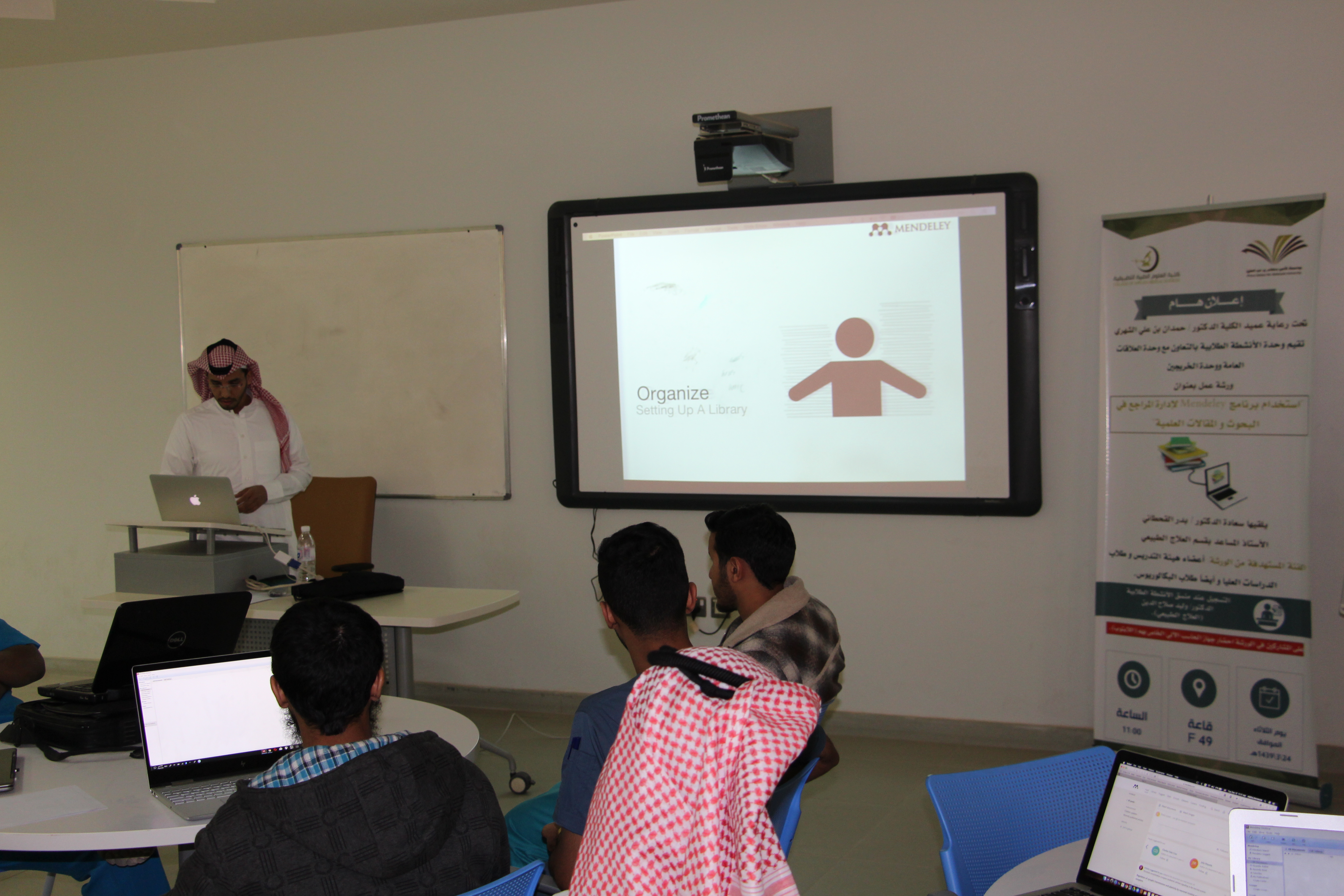 كتب/ د. وليد صلاح الدين تحت رعاية عميد الكلية الدكتور/ حمدان بن علي الشهري أقامت وحدة الأنشطة الطلابية بالتعاون مع وحدة العلاقات العامة والاعلام والخريجين ورشة عمل بعنوان   “Mendeley” لإدارة المراجع العلمية" ألقاها سعادة الدكتور/ بدر القحطاني الأستاذ المساعد بقسم العلاج الطبيعي وكان ذلك في يوم الثلاثاء الموافق 24/3/1439 هــ. بدأ سعادته التعريف بالبرنامج المستخدم في إدارة المراجع العلمية ومدى أهميته في تسهيل كتابة المراجع العلمية بدون أخطاء. وتتطرق بعد ذلك الى سرد خطوات أستخدام البرنامج وكيفية التغلب على المشاكل التقنية التي ممكن أن تواجه الباحث، وأخر الورشة تم تنفيذ تدريب عملي للمتدربين. وقد  أعرب المتدربين من أعضاء هيئة التدريس والطلاب عن اعجابهم الكبير بالمحتوى العلمي للورشة متمنيين للمحاضر دوام التوفيق والسداد.