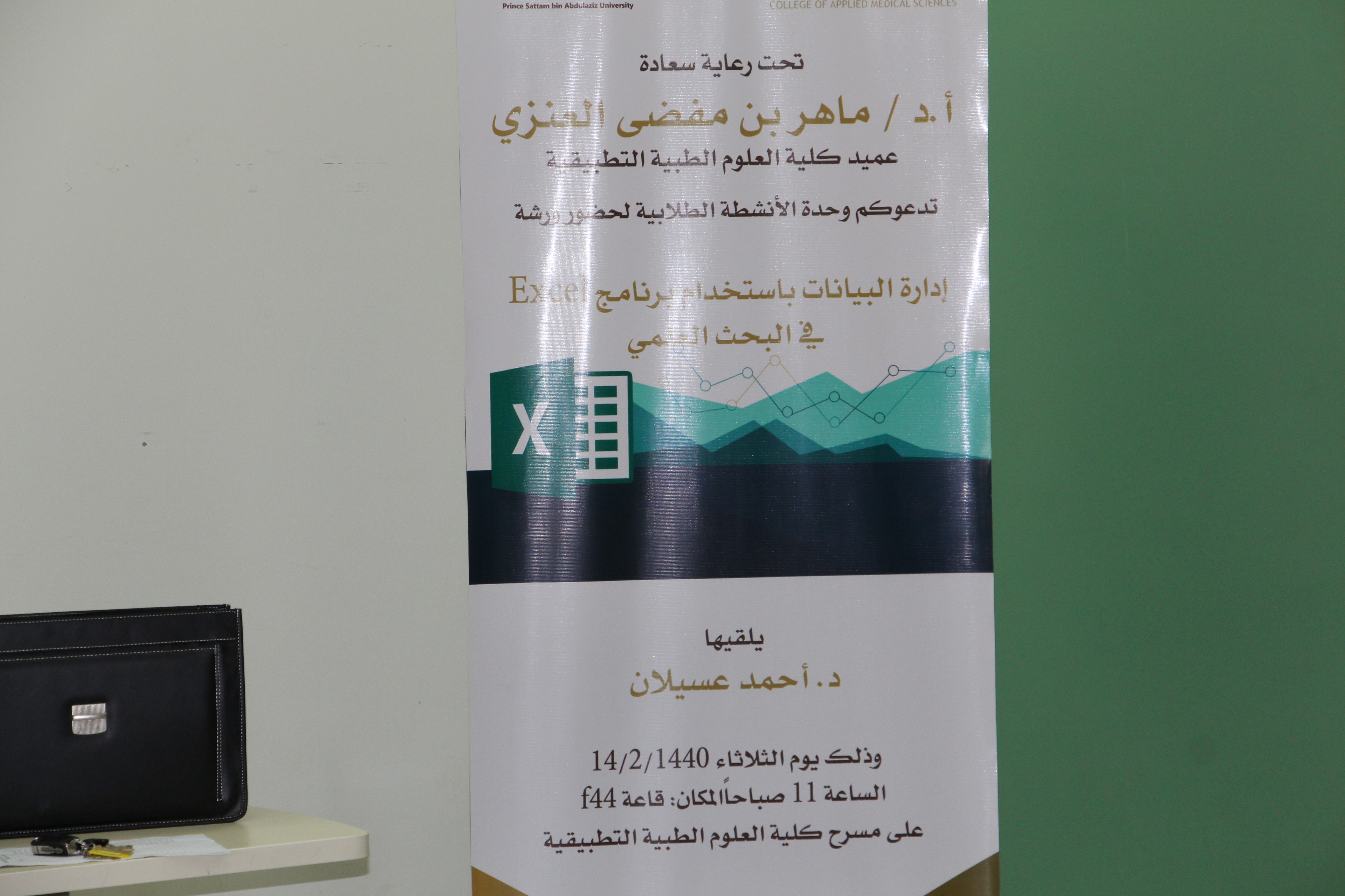 أقامت كلية العلوم الطبية التطبيقية ورشة تدريبية حول إدارة البيانات باستخدام برنامج الأكسل في البحث العلمي، ألقاها سعادة الدكتور أحمد عسيلان.تحدث فيها الدكتور عن كيفية التعامل مع البيانات وترتيبها ومن ثم إدخالها في البرنامج، كما تحدث عن كيفية التعامل مع البيانات المفقودة، أيضاً قدم شرح مفصل عن أنواع المتغيرات وكيفية استعادة البيانات المفقودة وطريقة المعادلات الحسابية عليها، ومن ثم استخراج البيانات الإحصائية عليها.الجدير بالذكر أن وحدة الأنشطة الطلابية بكلية العلوم الطبية التطبيقية تقيم العديد من الفعاليات والندوات المتنوعة والتي تقدمها بشكل مستمر طوال العام الدراسي.