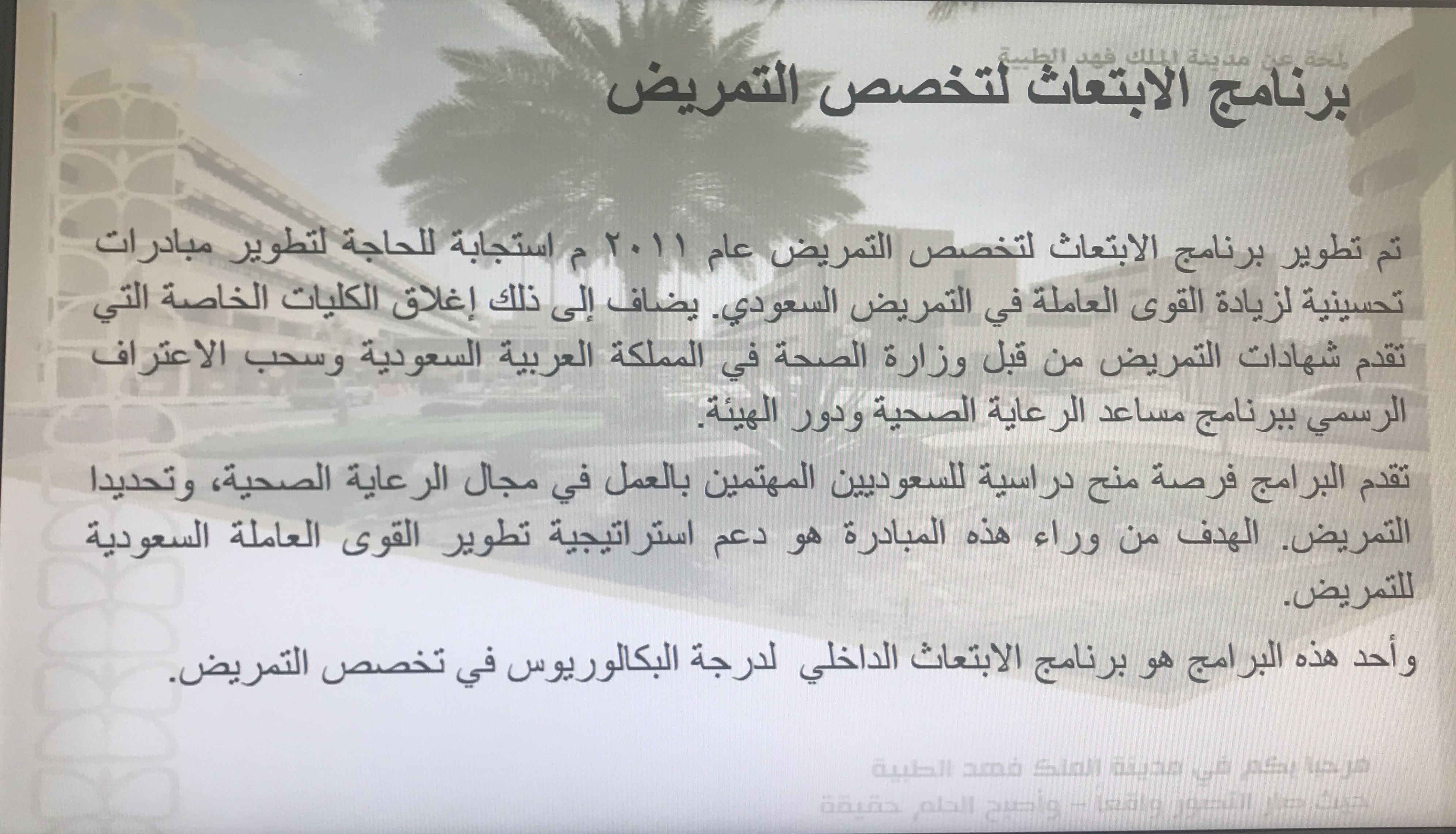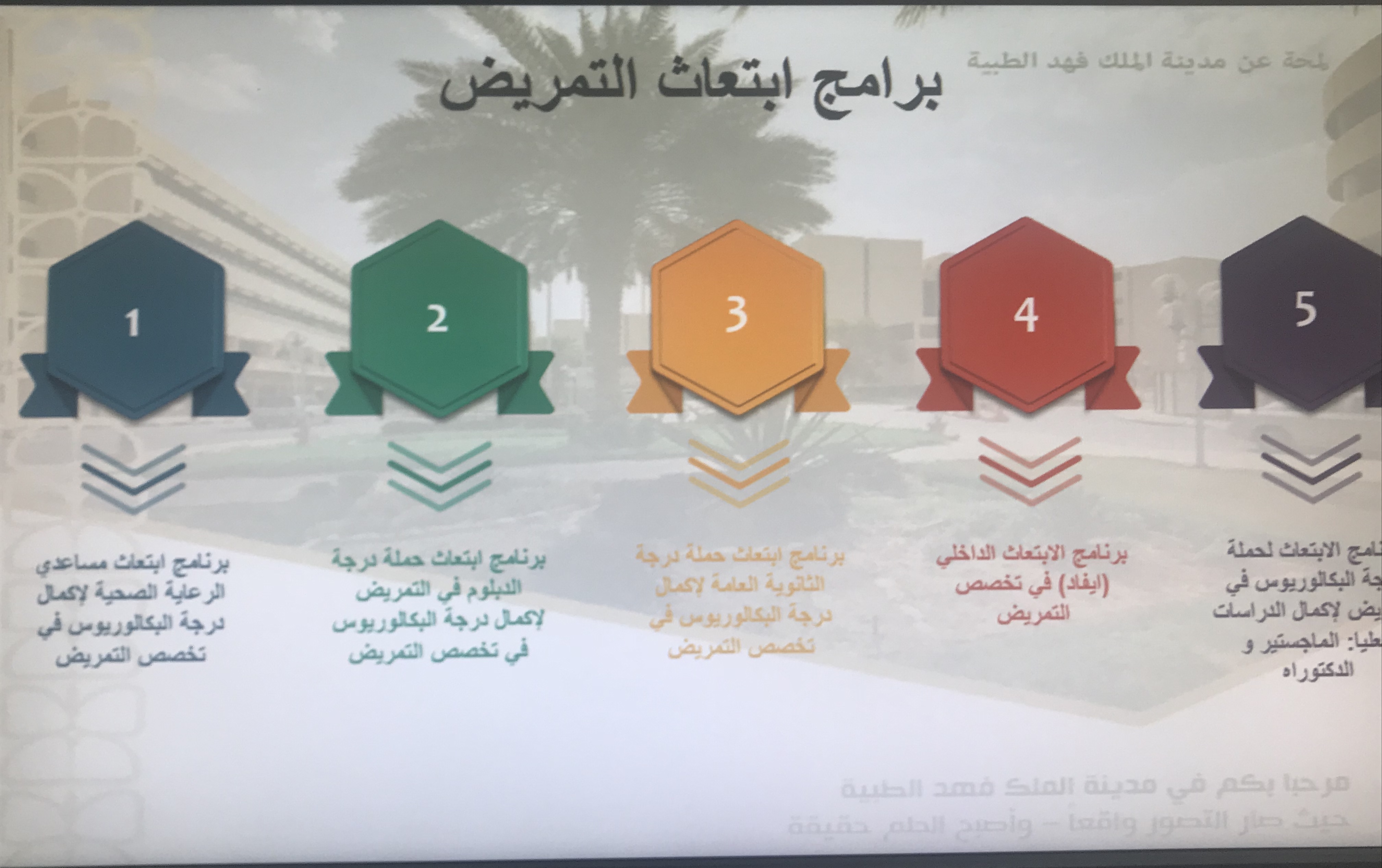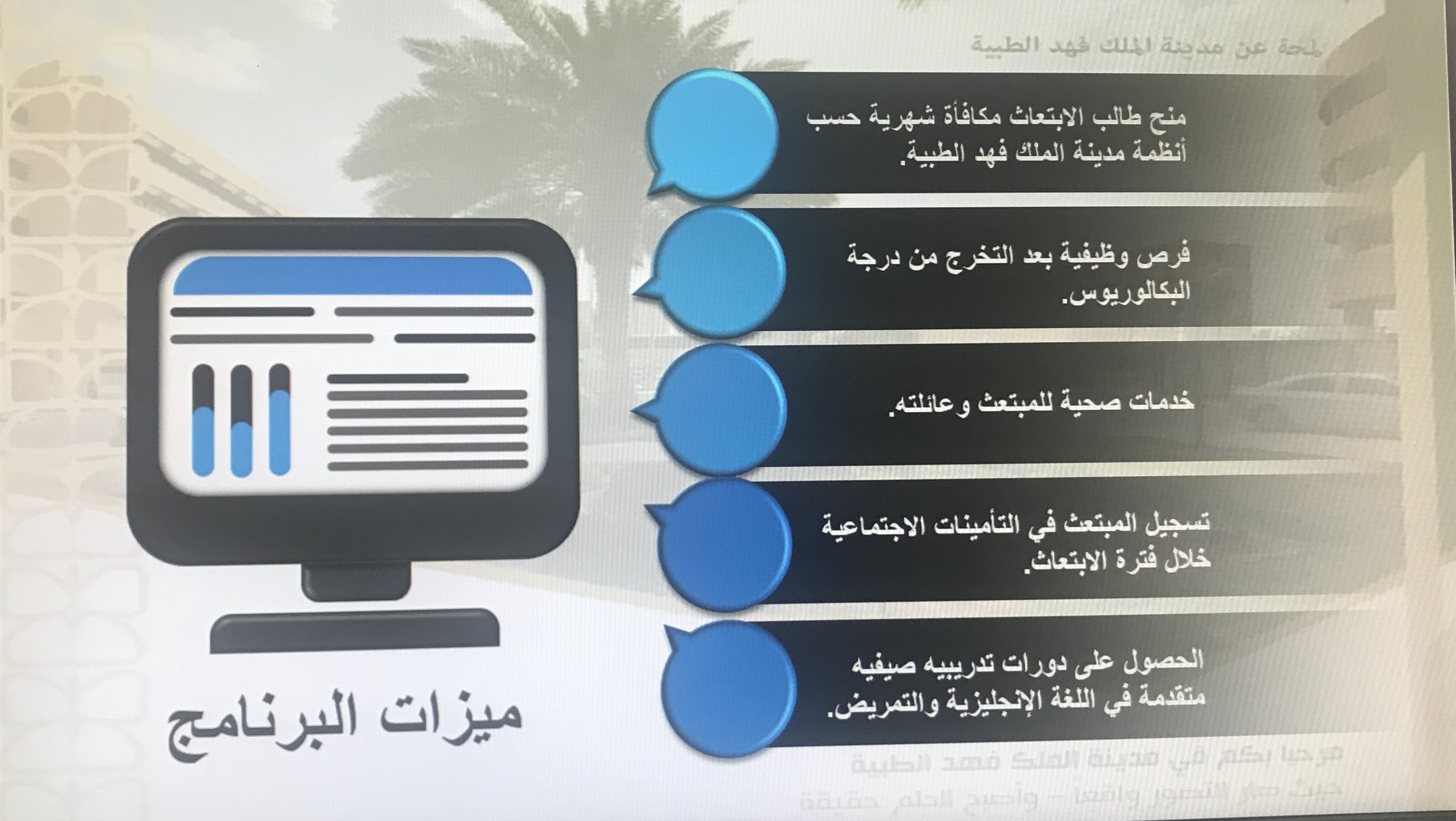 استضافه كليه العلوم الطبيه التطبيقيه يوم الاثنين الموافق 19/11/20180م ممثله بوحدة التدريب والامتياز وقسم التمريض و وفد من مدينه الملك فهد الطبية ممثله بقسم الابتعاث الداخلي وذلك لاستقطاب طالبات التمريض للابتعاث الداخلي بمدينه الملك فهد الطبية. حضر اللقاء من منسوبي الكلية سعادة وكيله كلية العلوم الطبيه التطبيقه سعادة الدكتورة نوره الضعيان ومساعدة الوكيله للشؤون الإكلينيكية الأستاذة ايمان الصيعري والمدير الإداري والمالي للكلية الأستاذة هدئ الرباح، ومن منسوبي المستشفى الأستاذة بسمه بالغيث منسق اداري ولأستاذه روث روميرو منسق تعليم تمريض والممرضة اروى الزهراني و الاشراف عن بعد من قبل الأستاذ حسام الظاهر رئيس قسم الابتعاث بمدينه الملك فهد الطبية . وحضر اللقاء عدد 55 طالبه من قسم التمريض. وقد أثمر اللقاء عن استحسان الطرفين وذلك عن طريق تحقيق الأهداف المرجوة.